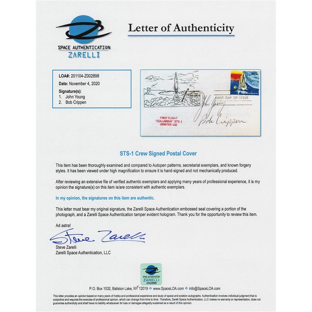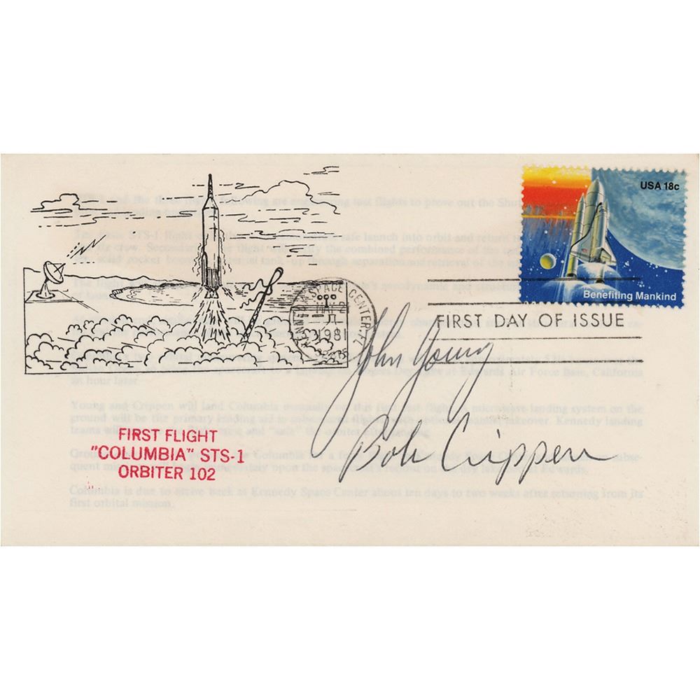 FDC with a stamped cachet honoring the first flight of Space Shuttle Columbia on STS-1, signed in black ballpoint by John Young and Bob Crippen. Interestingly, Young's signature and the cachet image date to the Gemini era (Young flew on both Gemini 3 and Gemini 10); the postage stamp, red-stamped STS-1 text, postal cancellation, and Crippen's signature would have been added later. In very fine condition. Accompanied by a full letter of authenticity from Zarelli Space Authentication.