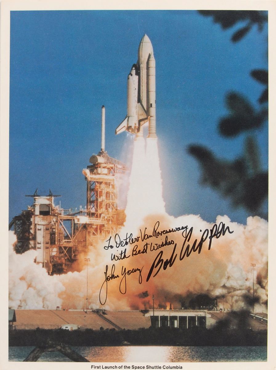 Official color 8 x 10 NASA lithograph of the first launch of Space Shuttle Columbia, signed and inscribed in black felt tip, “To Detlev Van Ravenswaay, With Best Wishes, John Young” and “Bob Crippen.” In fine condition.