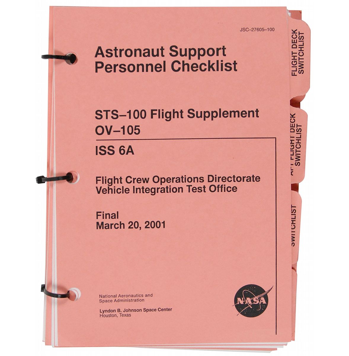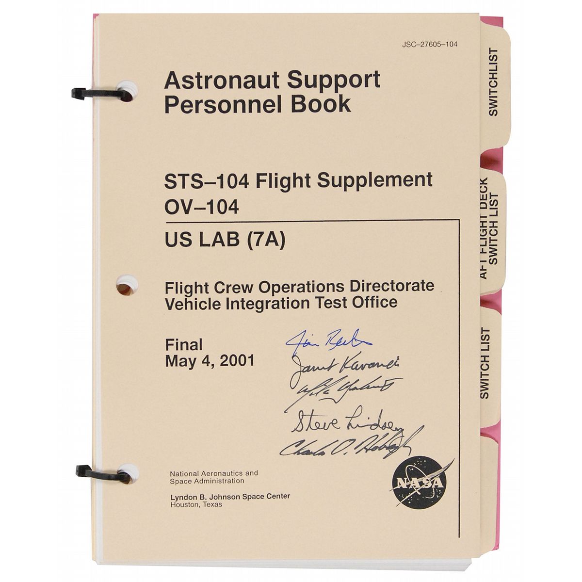 Two Space Shuttle flight supplement booklets: one titled “Astronaut Support Personnel Book: STS-104 Flight Supplement,” dated May 4, 2001, signed on the front cover in blue and black felt tip by James Reilly, Janet Kavandi, Michael Gernhardt, Steven Lindsey, and Charles O. Hobaugh; and an unsigned booklet titled “Astronaut Support Personnel Checklist: STS-100 Flight Supplement,” dated March 20, 2001. In overall fine condition.