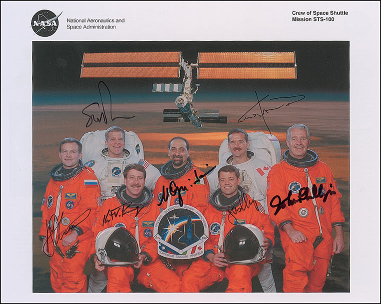 Color 10 x 8 NASA photo of the Endeavour crew, signed in black felt tip and ink by all seven crew members: Kent Rominger, Jeffrey Ashby, Scott Parazynski, John Phillips, Chris Hadfield, Umberto Guidoni, and Yuri Lonchakov. In fine condition.