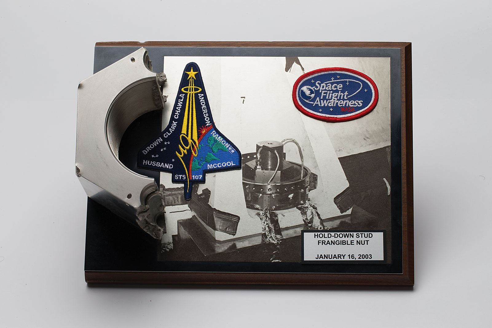 Half of a large hold-down stud frangible nut, measuring 2.75 x 5.75 x 4, applied to a wooden 11.75 x 9 plaque attributing it to the STS-107 launch on January 16, 2003. The heavy piece weighs an overall 10.2 pounds. In fine condition. Prior to Space Shuttle launches, frangible nuts were placed at the top of the four long bolts that secured each SRB to the Mobile Launch Platform. At the instant of launch, two embedded detonators broke each nut into two halves, allowing the release of the craft from the platform.
