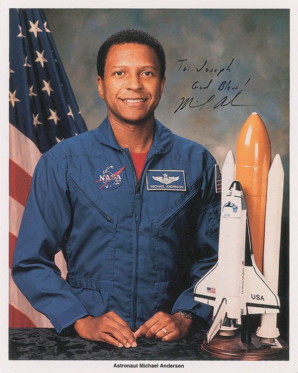 Astronaut (1959–2003) on Space Shuttle Columbia’s tragic STS-107 mission. Color 8 x 10 photo of Anderson posing with a model of the space shuttle, signed and inscribed in black felt tip “To: Joseph, God bless! Michael Anderson.” In fine condition, with a few scattered creases.