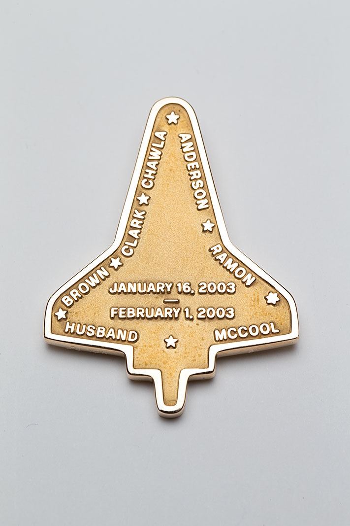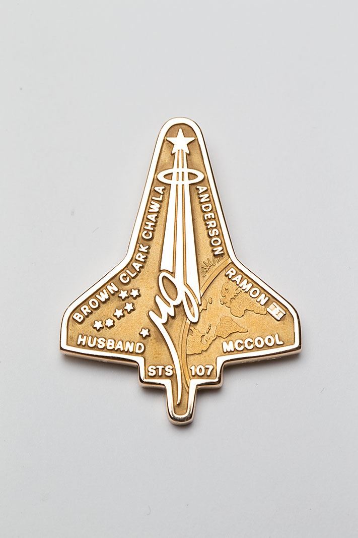 Very rare unflown 10K gold STS-107 Robbins medal, approximately 1.5? x 2?, featuring a raised design of the mission insignia on the face. The reverse features raised text with the launch date of January 16, 2003, the tragic reentry date of February 1, 2003, and the surnames of the astronauts who perished in the Space Shuttle Columbia disaster. The medal is serial numbered "21" and stamped with the Robbins hallmark on the edge. Condition is mint state. Accompanied by the original plastic box with stiff blue liner, as well as an original Robbins memo allowing for the purchase of STS-107 medals; color copies of the mission insignia, crew portrait, and a description of the insignia's meaning are attached. Also includes a larger hinged "Robbins Awards" case, measuring 6? x 4? x 1?. From the collection of a former Robbins Company executive. Only 23 of these medals were minted in 10K gold, making this an extremely scarce and highly desirable example.