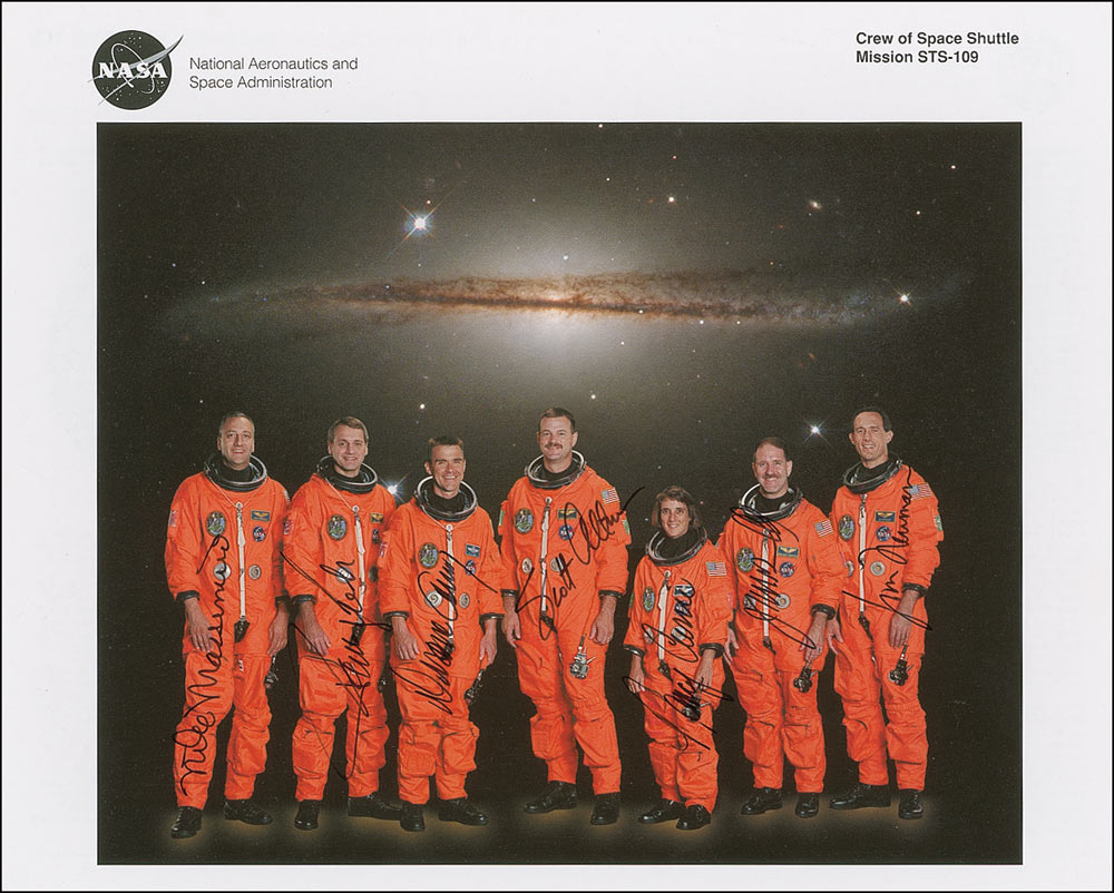 Color 10 x 8 NASA photo of the Columbia crew, signed vertically in black ink by all seven crew members: Scott Altman, Duane Carey, John Grunsfeld, Nancy Currie, Richard Linnehan, Michael Massimino, and James Newman. In fine condition. This mission serviced the Hubble telescope, and was also the last successful mission before the Columbia disaster.