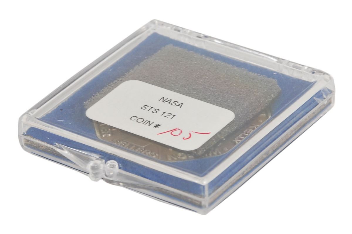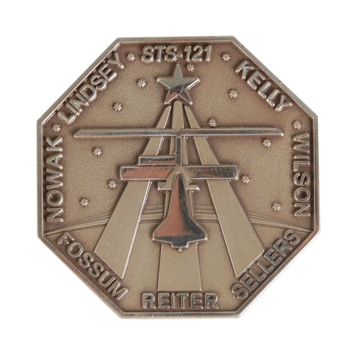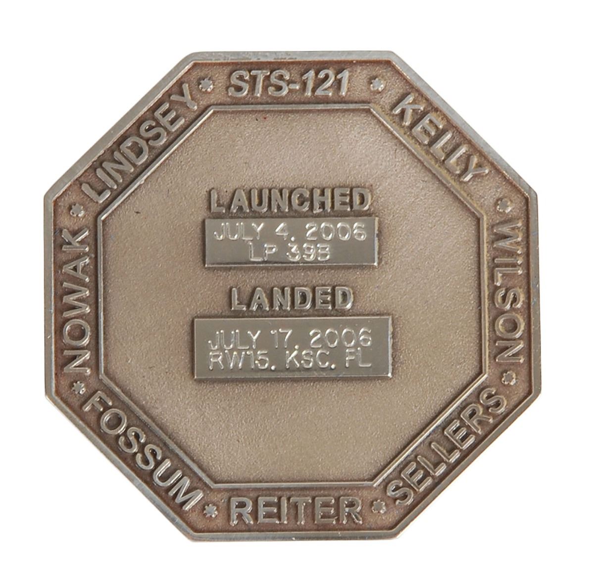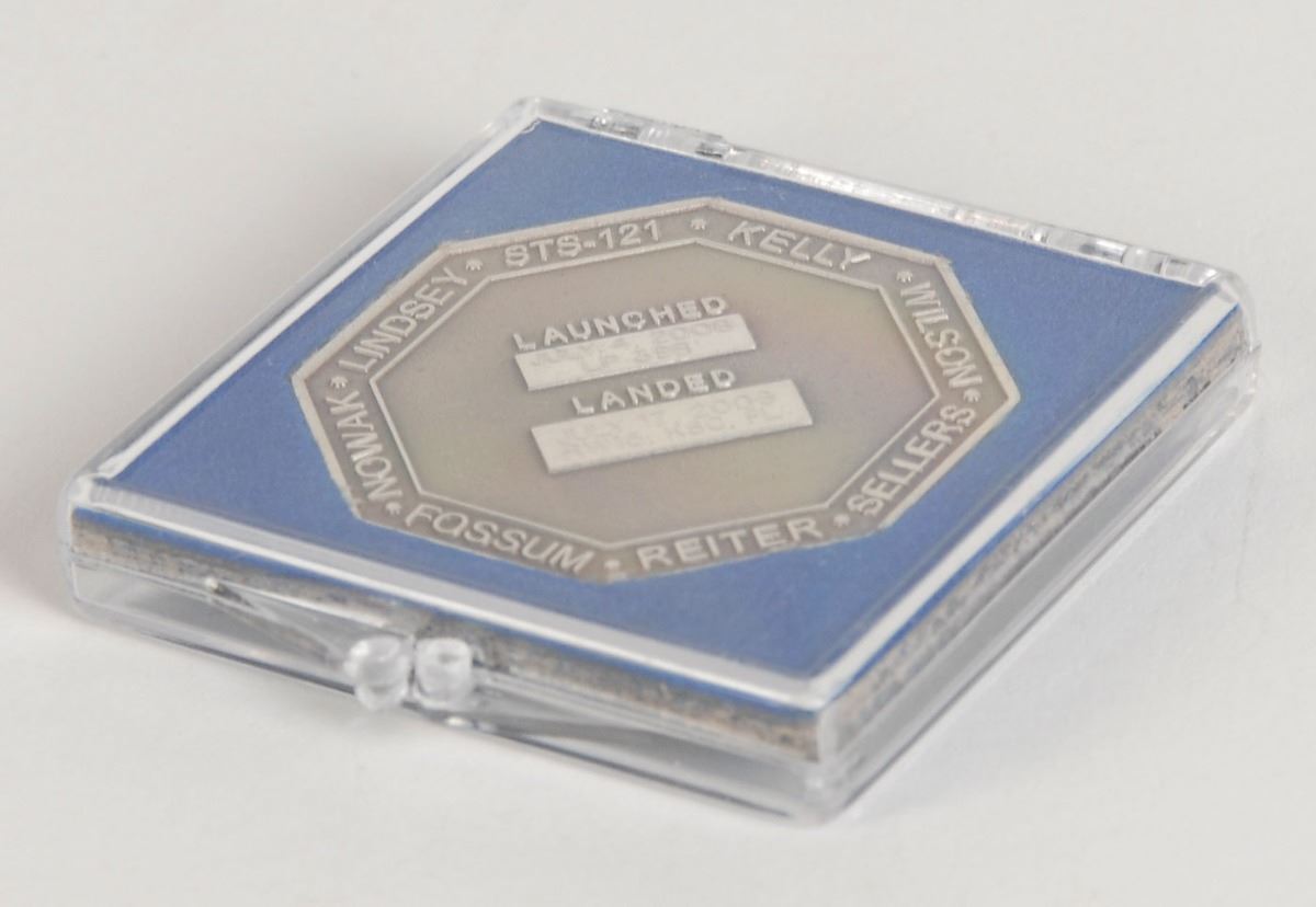 Unflown sterling silver STS-121 Robbins medal, 1.5 x 1.5, with a raised design on the face featuring the mission insignia and encircled with the astronaut’s names. The reverse is also encircled with the names of the astronauts, and is engraved with the launch date of July 4, 2006 “LP 39B,” and landing date of July 17, 2006, “RW15, KSC, FL.” The medal is serial numbered “105” on the rim, and is accompanied by its original matching case. Condition is mint state. This STS-121 Robbins medal features the name of mission specialist Lisa M. Nowak, who was responsible for operating the robotic arms of the shuttle and the International Space Station. On February 5, 2007, Nowak was arrested and subsequently charged with the attempted kidnapping of US Air Force Captain Colleen Shipman, the girlfriend of William Oefelein, an STS-16 astronaut with whom Nowak had previously been involved. Her assignment to the space agency as an astronaut was terminated by NASA effective March 8, 2007.