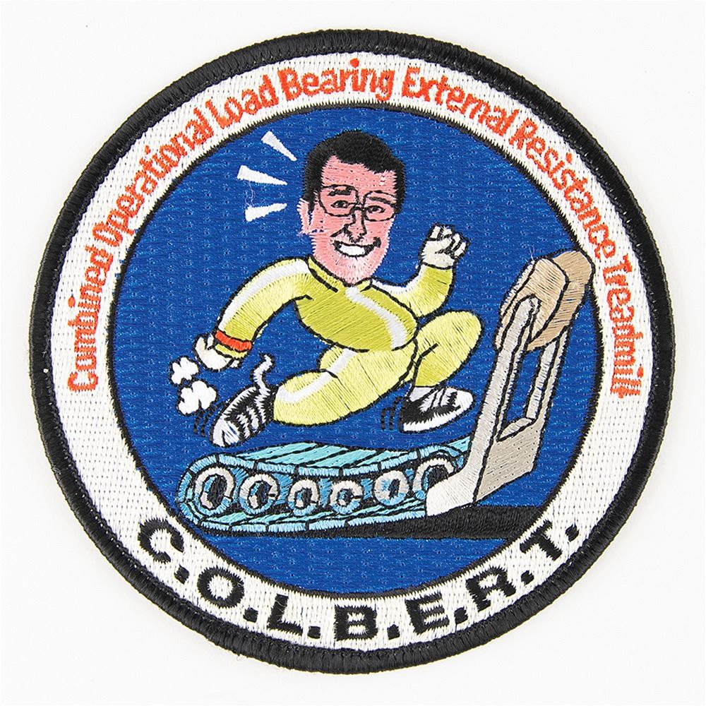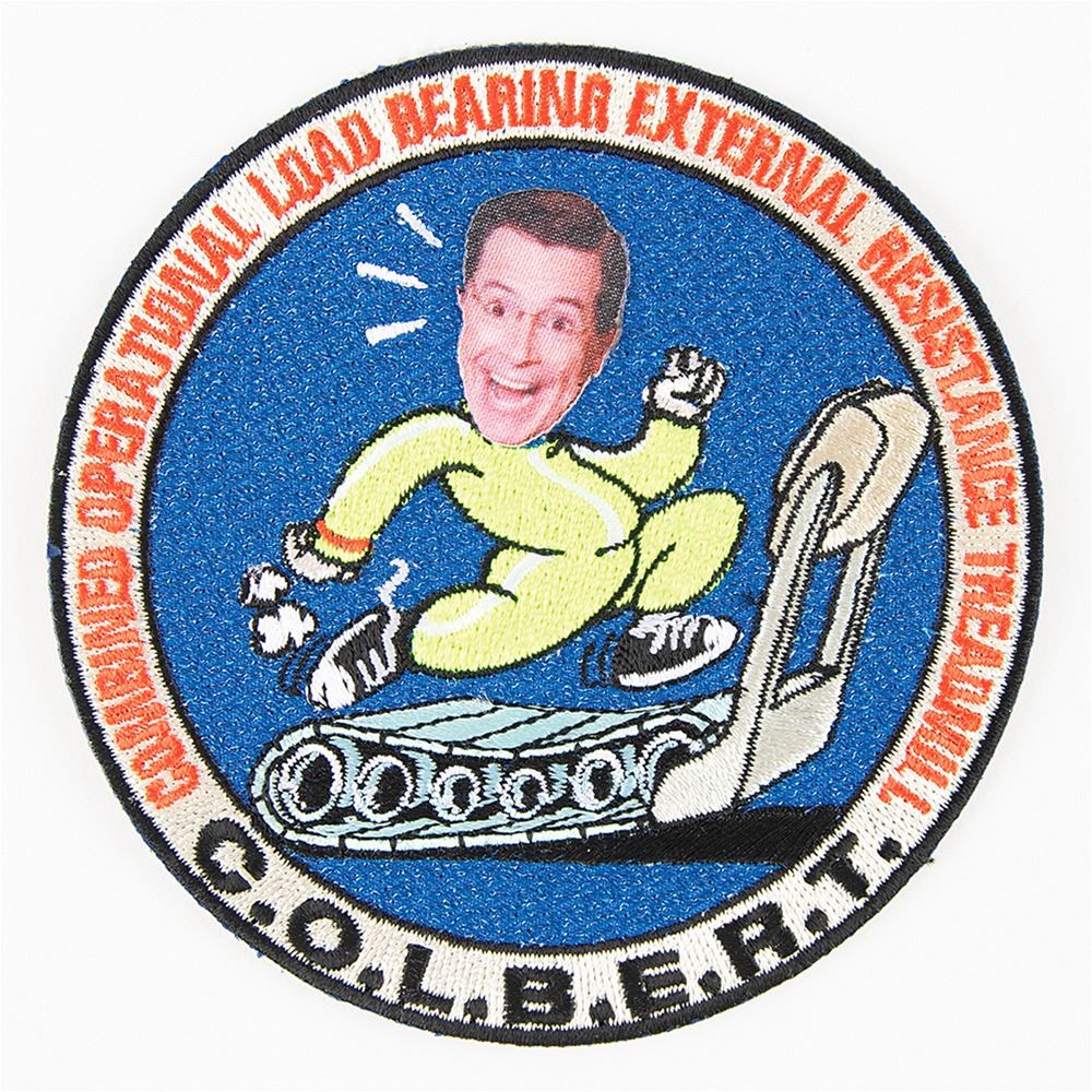 Very rare embroidered patch for the COLBERT, a new treadmill delivered to the International Space Station by the STS-29 mission, 4è in diameter, which depicts comedian and TV personality Stephen Colbert running on said exercise machine, with border text reading: ‰ÛÏCombined Operational Load Bearing External Resistance Treadmill, C.O.L.B.E.R.T.‰Û The consignor notes that less than 100 of these patches were produced. Also includes a reproduction patch for the COLBERT, which is quite rare and desirable in its own right. In overall fine condition