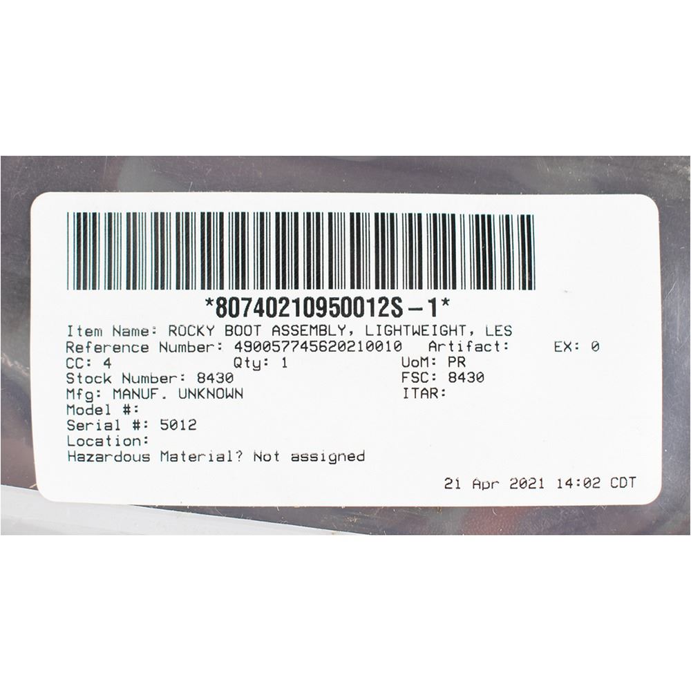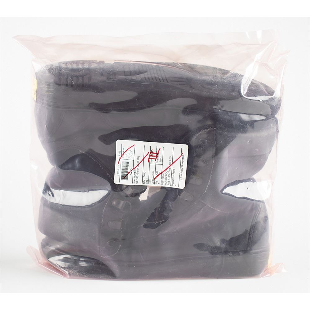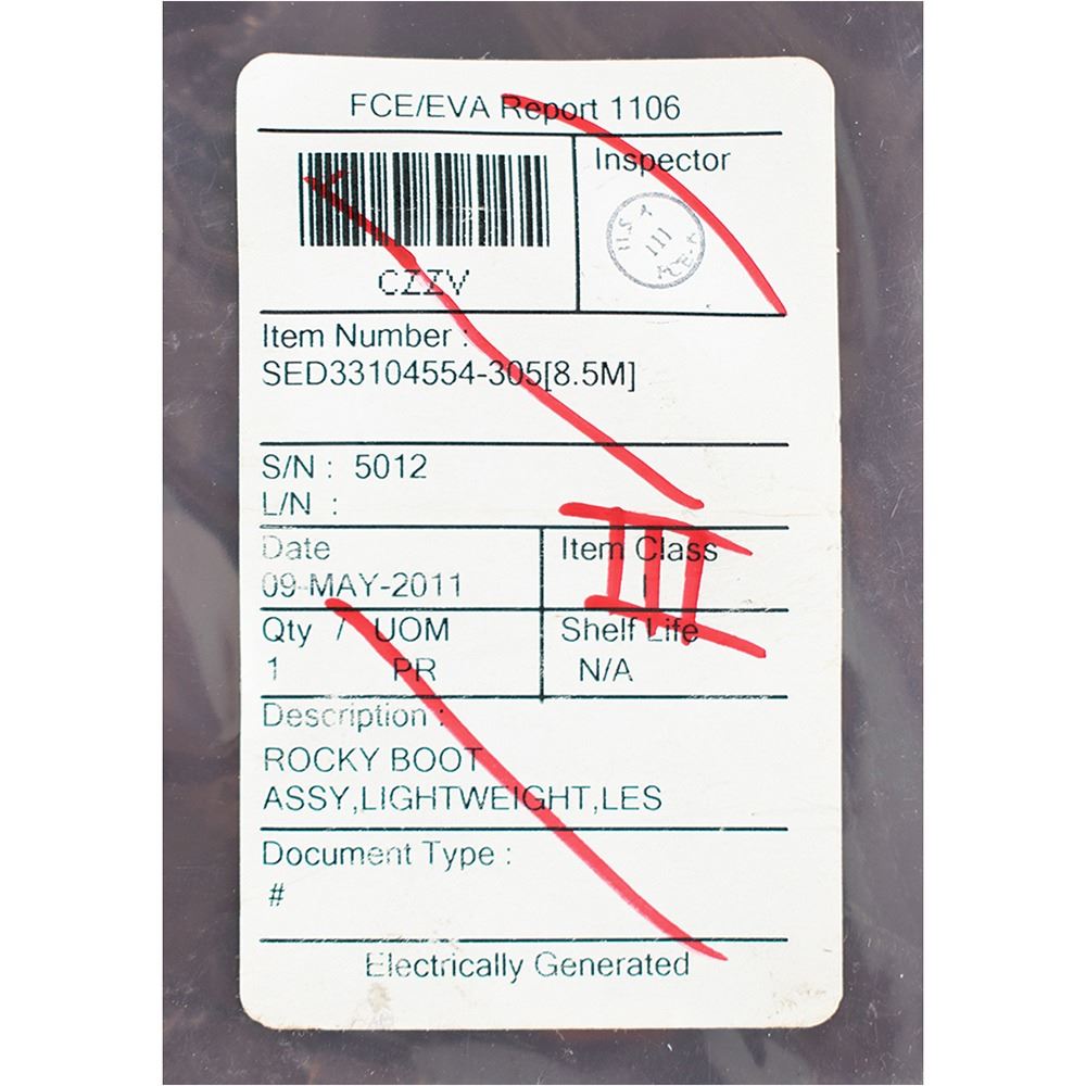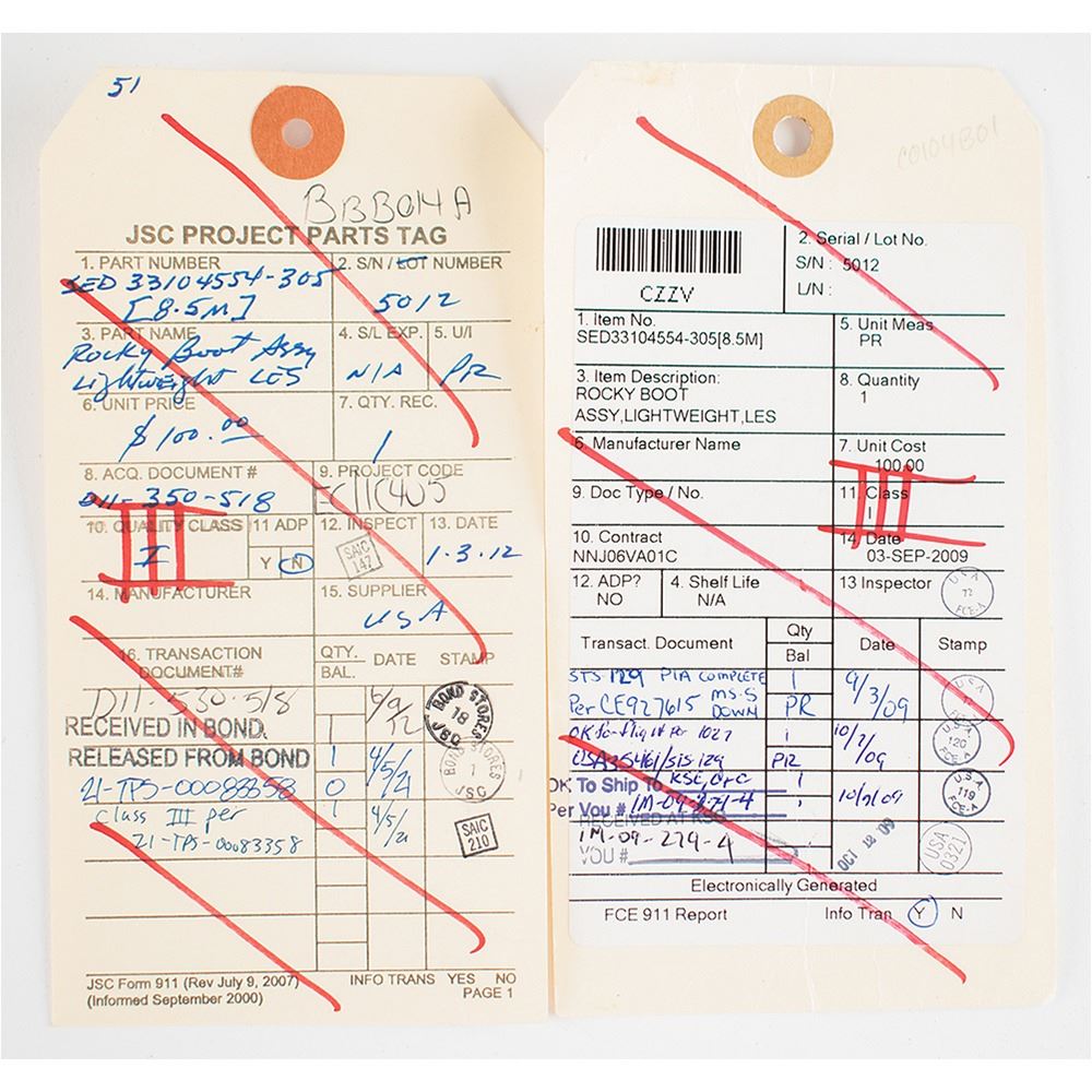Pair of lightweight Rocky 911 Series Launch Entry Suit (LES) boots issued as flight-ready for a journey to the International Space Station (ISS) aboard the Space Shuttle Atlantis orbiter for the STS-129 mission. The black leather-and-canvas mid-calf-length boots feature Vibram soles and retain their original laces, and the heel of the left foot bears an affixed yellow label marked “S/N 5012, 8.5 M.” The boots are sealed in their deaccession bag with affixed labels, one of which is struck through in red felt tip and marked “III.” Includes a NASA Excess Transportation Document, with an excess date of April 5, 2021, and a “JSC Project Parts” tag also marked “III,” which reads: “Part Number SED 33104554-305, [8.5 M], S/N 5012, Part Name Rocky Boot Assy Lightweight LES,” with the lower portion of the attached FCE 911 Report annotated “STS0129 PIA Complete, Per CE927615 MS-S Down…9/3/09,” “OK for flight per 1027, USA 35461/STS-129…10/7/09,” and “OK to Ship to KSC, C+C…10/9/09.” In fine condition, with a slice to the deaccession bag.
