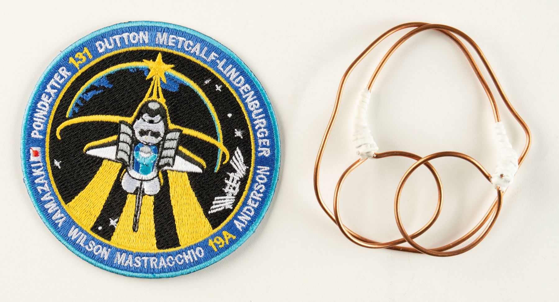 Two items flown on the Space Shuttle Discovery during STS-131: a wire tie used in the vacuum of space during a spacewalk (EVA) during STS-131; and a flown embroidered mission insignia patch for STS-131 flown to the ISS, signed and flight-certified on the reverse in black felt tip by Mission Specialist 1 Rick Mastracchio, "Flown, RM." In fine condition. Accompanied by one image of the patch in the spacecraft during the mission, and one of Mastracchio with wire ties during an EVA.
