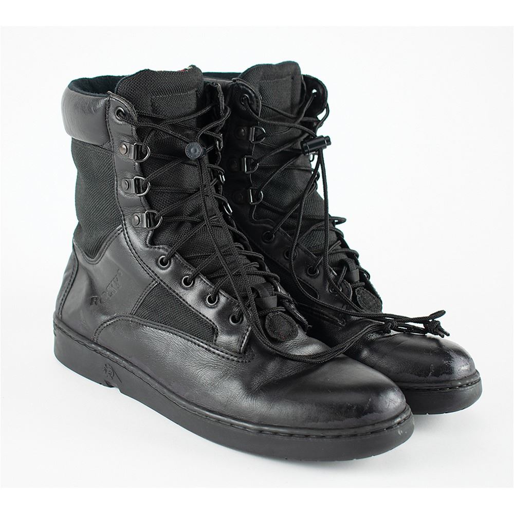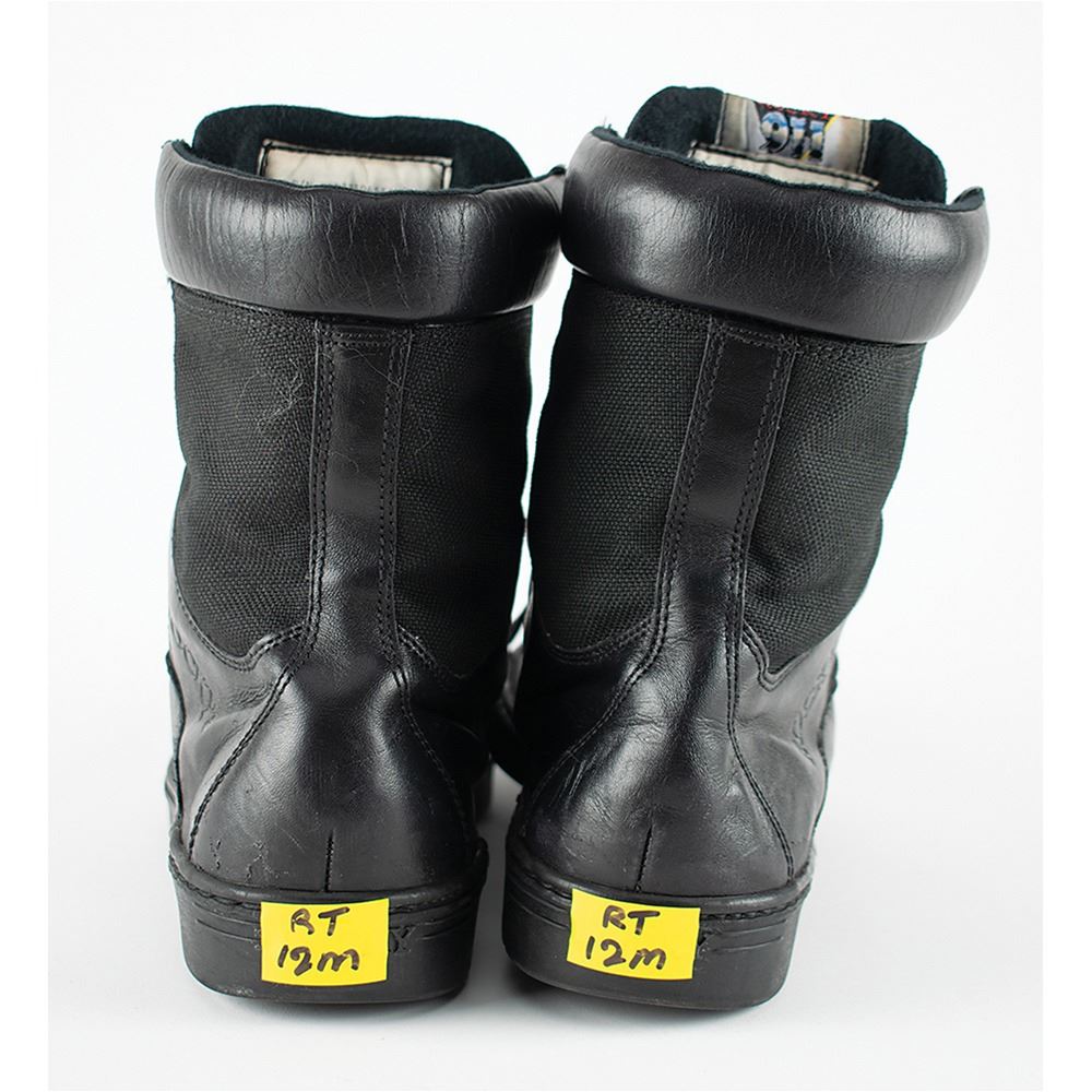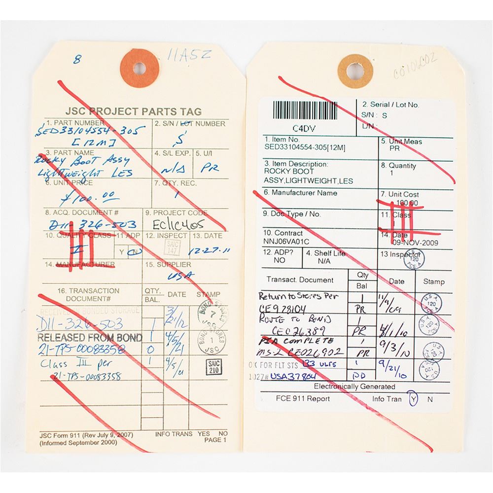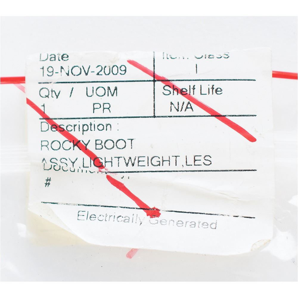 Pair of lightweight Rocky 911 Series Launch Entry Suit (LES) boots issued as flight-ready for a journey to the International Space Station (ISS) aboard the Space Shuttle Discovery orbiter for the STS-133 mission. The black leather-and-canvas mid-calf-length boots feature Vibram soles and retain their original laces, and the heels of both boots bear an affixed yellow label marked ‰ÛÏRT, 12 M.‰Û Includes the deaccession bag with affixed labels, a NASA Excess Transportation Document, with an excess date of April 5, 2021, and a ‰ÛÏJSC Project Parts‰Û struck through in red felt tip and marked ‰ÛÏIII,‰Û which reads: ‰ÛÏPart Number SED 33104554-305, [12 M], S/N S, Part Name Rocky Boot Assy Lightweight LES,‰Û with the lower portion of the attached FCE 911 Report marked ‰ÛÏPIA Complete, MS-2 CE026902‰Û_9/3/10‰Û and ‰ÛÏOK for FLT STS 133 ULF5, 1027, USA 37804‰Û_9/21/10.‰Û In fine condition, with some scuffing to toe and sole areas from use.