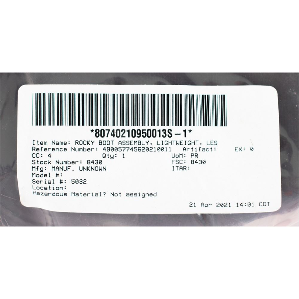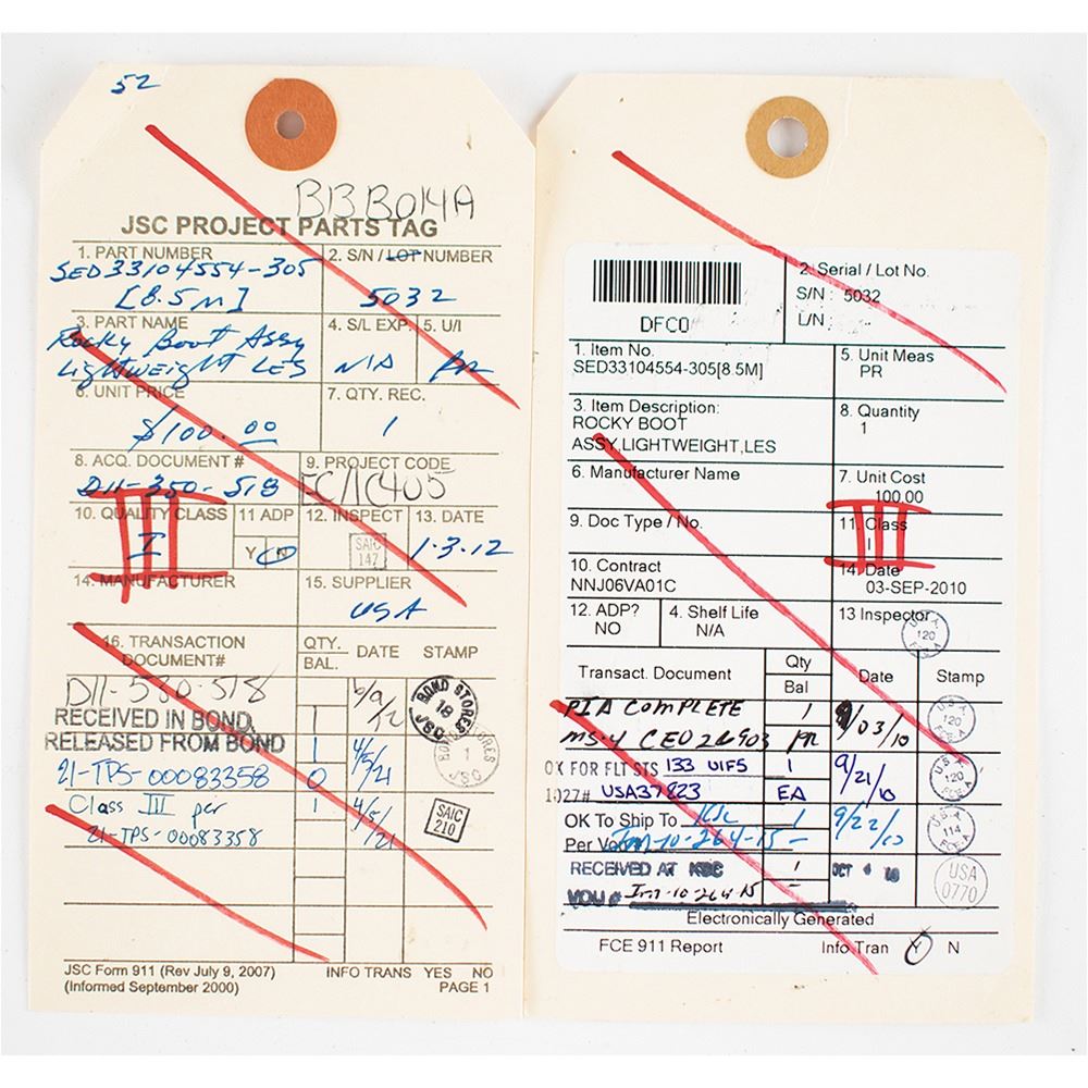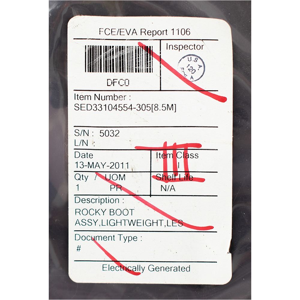 Pair of lightweight Rocky 911 Series Launch Entry Suit (LES) boots issued as flight-ready for a journey to the International Space Station (ISS) aboard the Space Shuttle Discovery orbiter for the STS-133 mission. The black leather-and-canvas mid-calf-length boots feature Vibram soles and retain their original laces, and the heel of the right foot bears an affixed yellow label marked “S/N 5032, 8.5 M.” The boots are sealed in their deaccession bag with affixed labels, one of which is struck through in red felt tip and marked “III.” Includes a NASA Excess Transportation Document, with an excess date of April 5, 2021, and a “JSC Project Parts” tag also marked “III,” which reads: “Part Number SED 33104554-305, [8.5 M], S/N 5032, Part Name Rocky Boot Assy Lightweight LES,” with the lower portion of the attached FCE 911 Report annotated “PIA Complete, MS-4 CE026903…9/03/10,” “OK for FLT STS 133 ULF5, 1027, USA 37823…9/21/10,” and “Received at KSC…Oct 4, 10.” In fine condition.