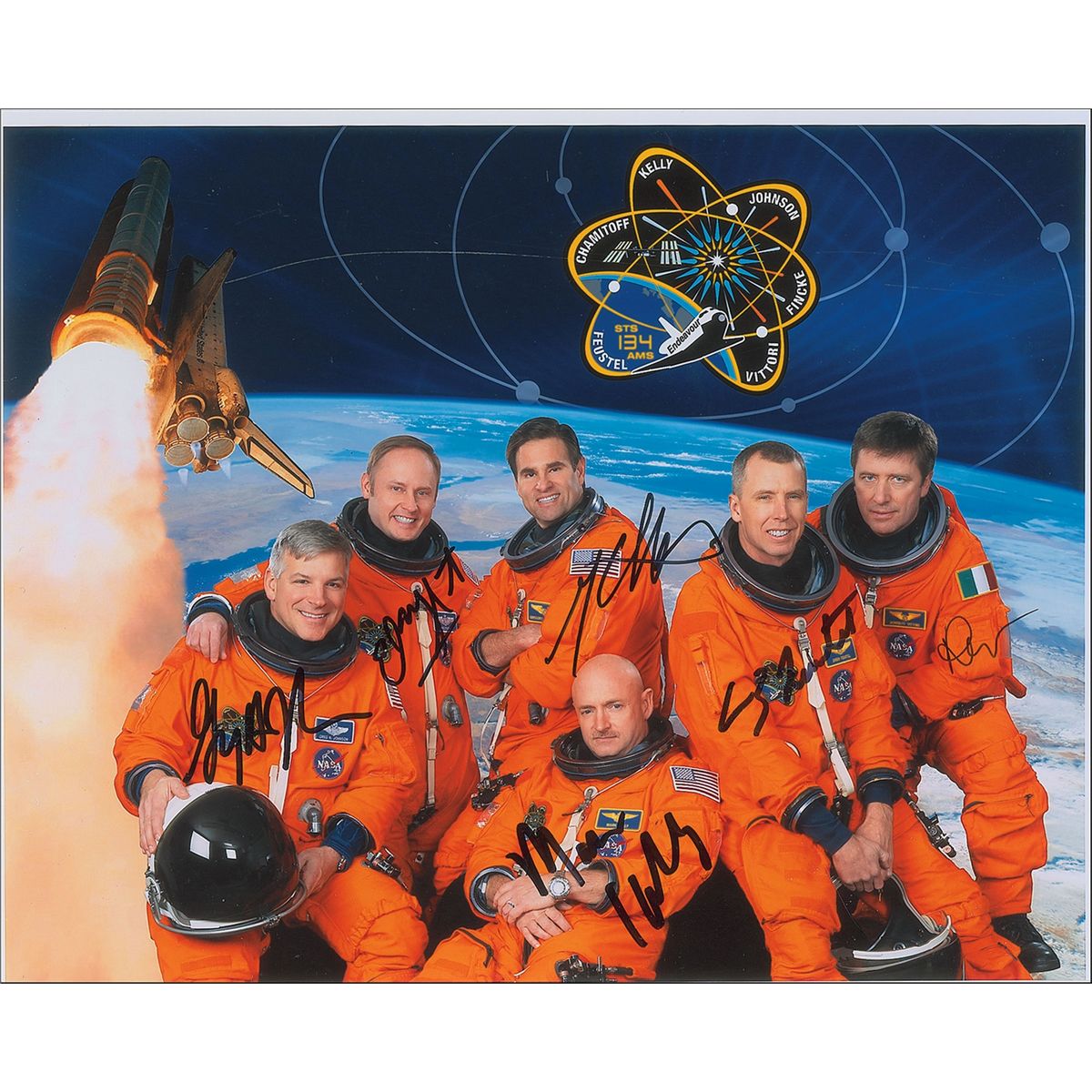 Color glossy 10 x 8 photo of the final crew of the Endeavour, signed in black felt tip by Mark Kelly, Gregory H. Johnson, Michael Fincke, Greg Chamitoff, Andrew Feustel, and Roberto Vittori. In fine condition.