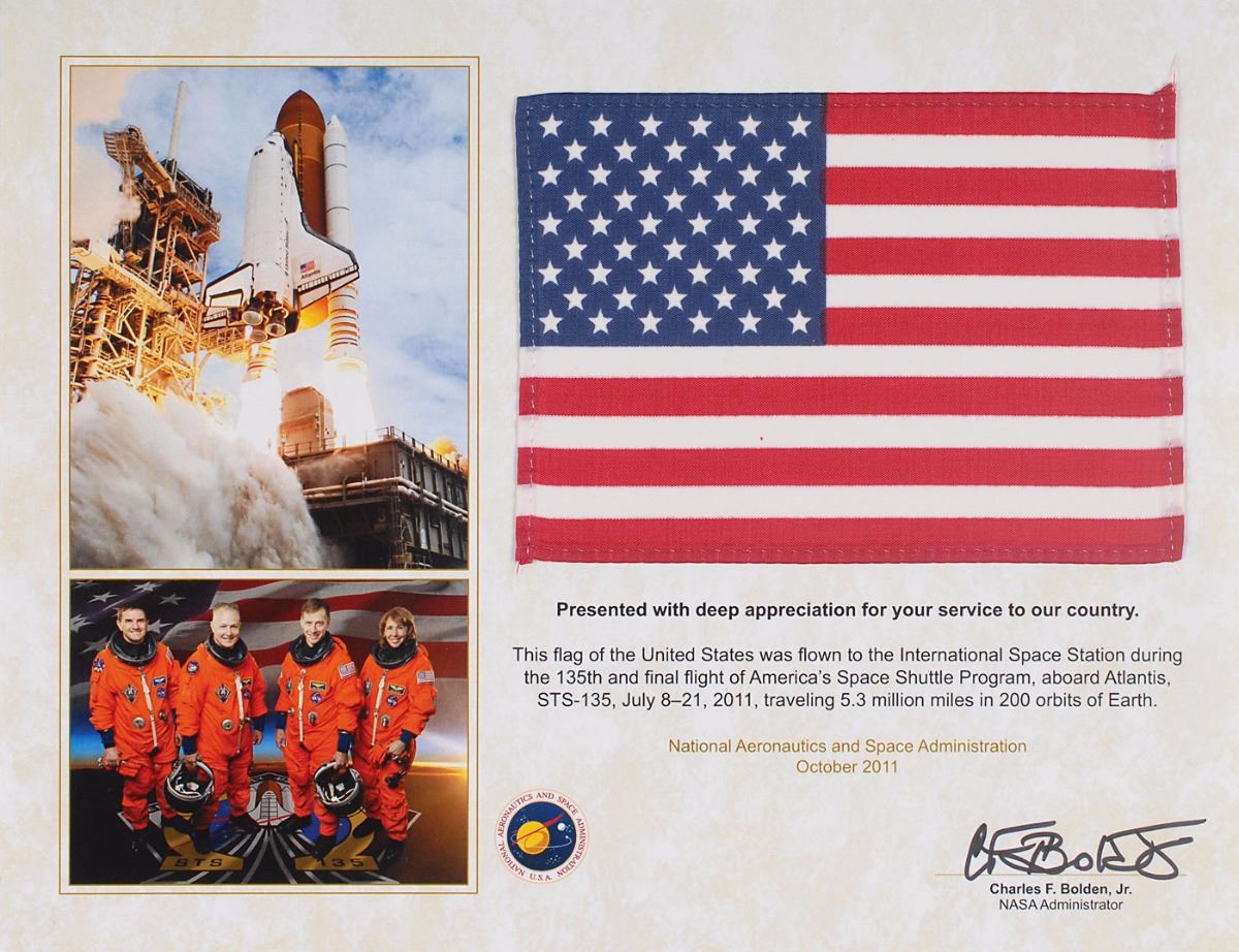 Flown American flag carried aboard the Space Shuttle Atlantis, 6 x 4, affixed to an 11 x 8.5 presentation sheet bearing a felt tip signature of NASA administrator Charles F. Bolden, Jr. Dated October 2011, the sheet reads, in part: “This flag of the United States was flown to the International Space Station during the 135th and final flight of America’s Space Shuttle Program…July 8–21, 2011, traveling 5.3 million miles in 200 orbits of Earth.” In fine condition.