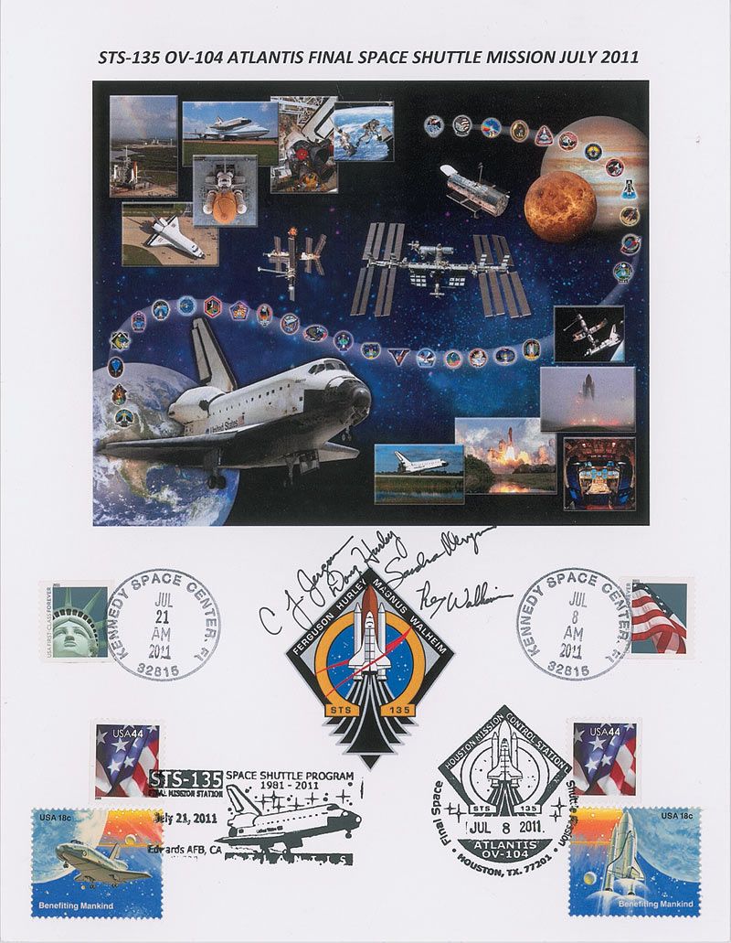 Color 8.5 x 11 cardstock photo commemorating the final shuttle mission, bearing several postage stamps, two stamped cachets, and launch and landing Kennedy Space Center cancellations, signed in black felt tip by Chris Ferguson, Doug Hurley, Sandra Magnus, and Rex Walheim. In fine condition.