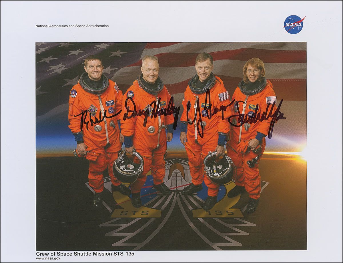 Color glossy cardstock 10 x 8 NASA photo of the crew posing in their flight suits against a patriotic background, signed in black felt tip by Christopher Ferguson, Douglas Hurley, Rex Walheim, and Sandy Magnus. In fine condition. The four person crew of this final shuttle mission was the smallest since the STS-6 in April of 1983.