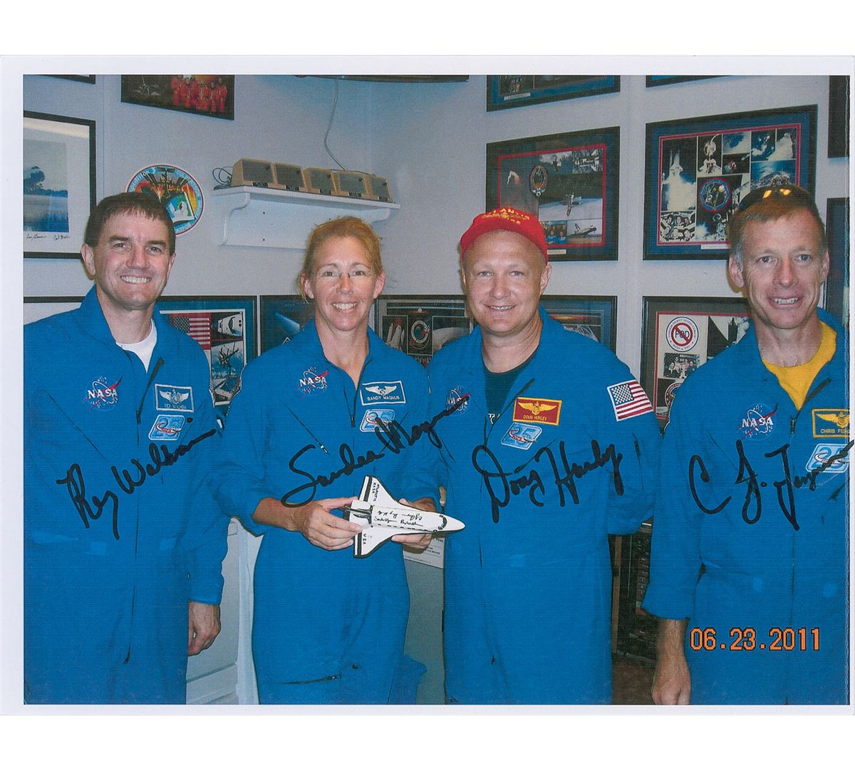 Color 11 x 8.5 laserprint photo of the shuttle crew posing in their blue flightsuits with a small shuttle model, signed in black felt tip by Chris Ferguson, Doug Hurley, Sandra Magnus, and Rex Walheim. In fine condition. Consignor notes signatures were acquired by a KSC worker.