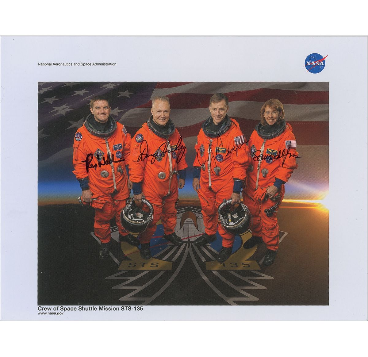 Color 11 x 8.5 NASA photo of the final shuttle crew posing in their orange flight suits, signed in black felt tip by Christopher Ferguson, Douglas Hurley, Rex Walheim, and Sandy Magnus. Some scattered creases, otherwise fine condition.