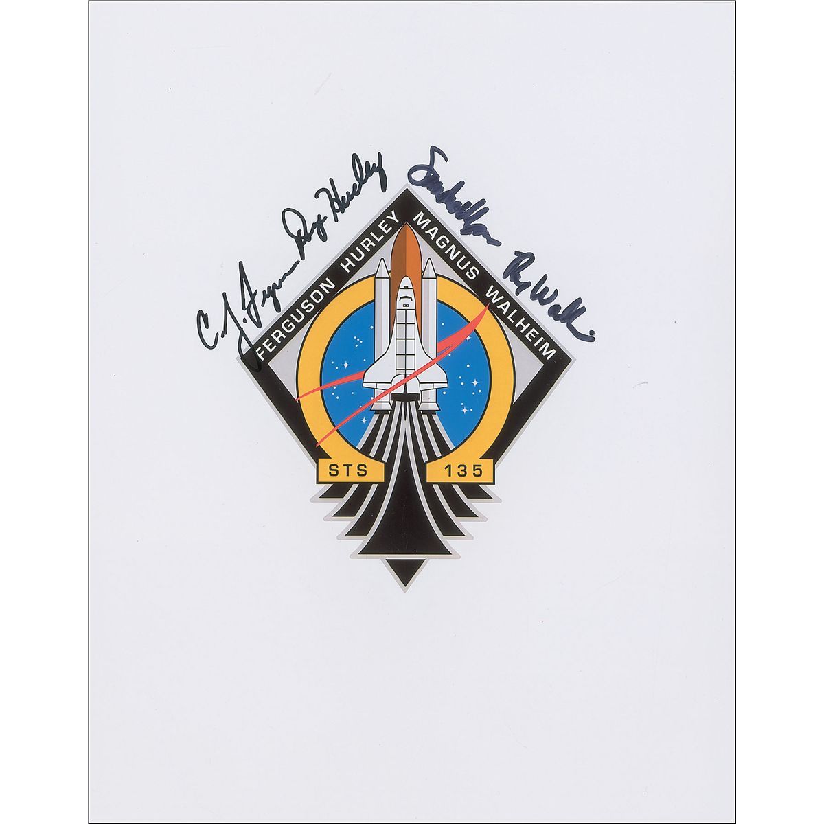 Color glossy 8 x 10 photo of the STS-135 mission emblem, signed in black felt tip by Chris Ferguson, Doug Hurley, Sandra Magnus, and Rex Walheim. In very fine condition.