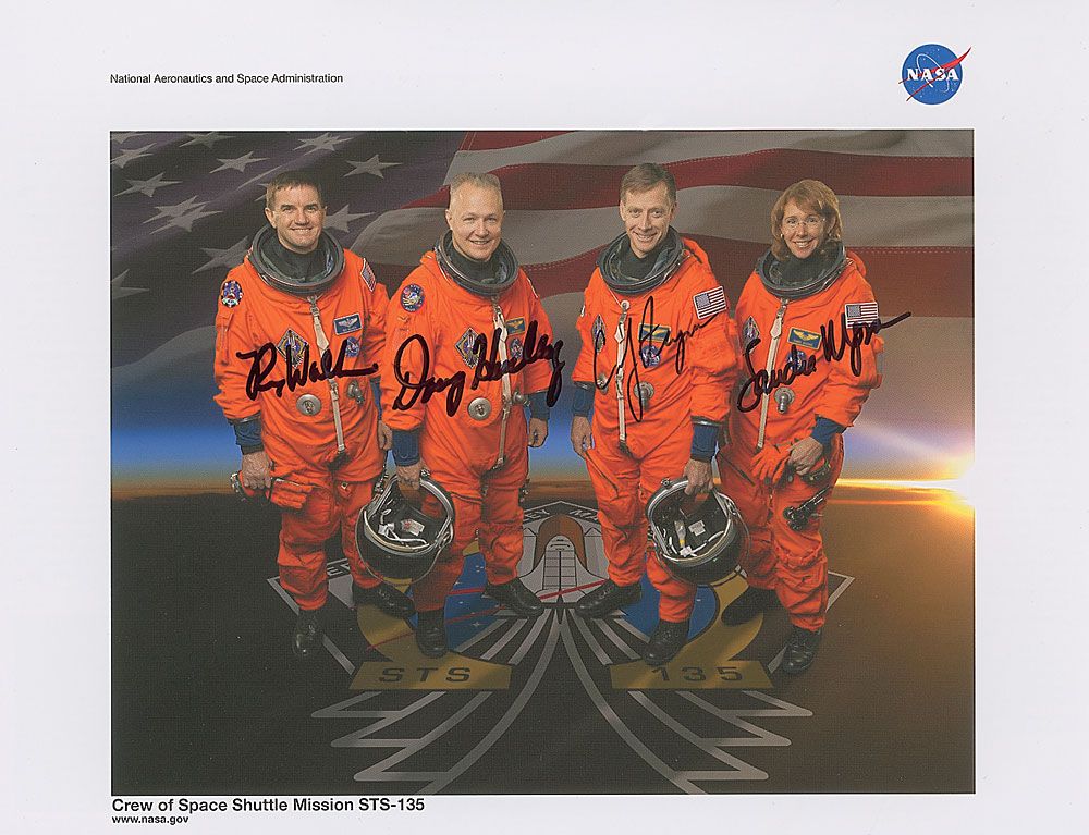 Color 11 x 8.5 NASA photo of the final shuttle crew posing in their orange flight suits, signed in black felt tip by Christopher Ferguson, Douglas Hurley, Rex Walheim, and Sandy Magnus. In very fine condition.