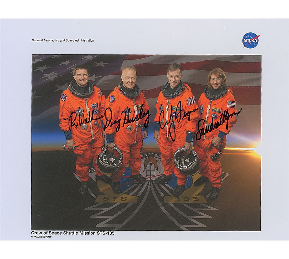 Official color 11 x 8.5 NASA lithograph of the full STS-135 crew, signed in black felt tip by Chris Ferguson, Doug Hurley, Sandra Magnus, and Rex Walheim. In fine condition.