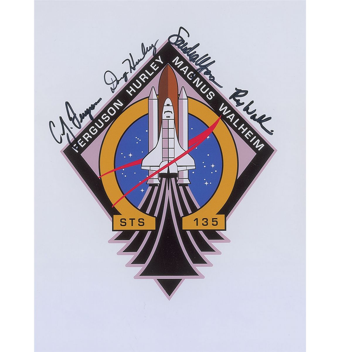 Color satin-finish 8.5 x 11 photo of the STS-135 mission emblem, signed in black felt tip by Chris Ferguson, Doug Hurley, Sandra Magnus, and Rex Walheim. In fine condition.
