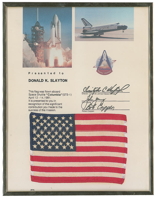 Flight-flown printed fabric American flag, 6 x 4, flown aboard the Space Shuttle Columbia during its inaugural flight on April 12–14, 1981, and presented to astronaut Deke Slayton. Flag is affixed to an 8.25 x 10.5 certificate stating “Presented to Donald K. Slayton. This flag was flown aboard Space Shuttle ‘Columbia’ (STS-1) April 12–14, 1981. It is presented to you in recognition of the significant contribution you made to the success of the mission.” Certificate also bears printed signatures of Shuttle astronauts John Young and Bob Crippen, as well as Director Chris Kraft. Framed to an overall size of 8.75 x 11.25. In fine condition, with uniform toning to white stripes of flag, most likely from adhesive on reverse. Slayton served as Head of Shuttle Approach and Landing Tests Program for NASA's space shuttle program.