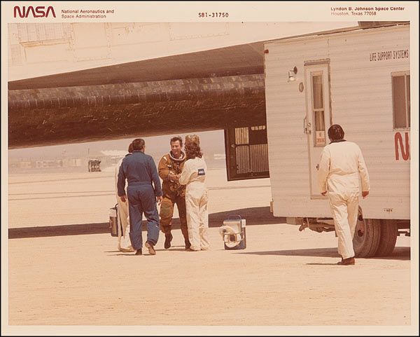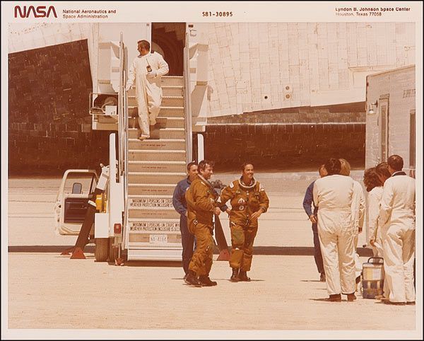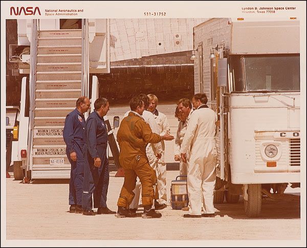 Three unsigned color satin-finish 10 x 8 ‘red-numbered’ NASA photos of STS-1 crew members John Young and Bob Crippen shortly after landing and being greeted by members of the grounds crew. In fine condition.