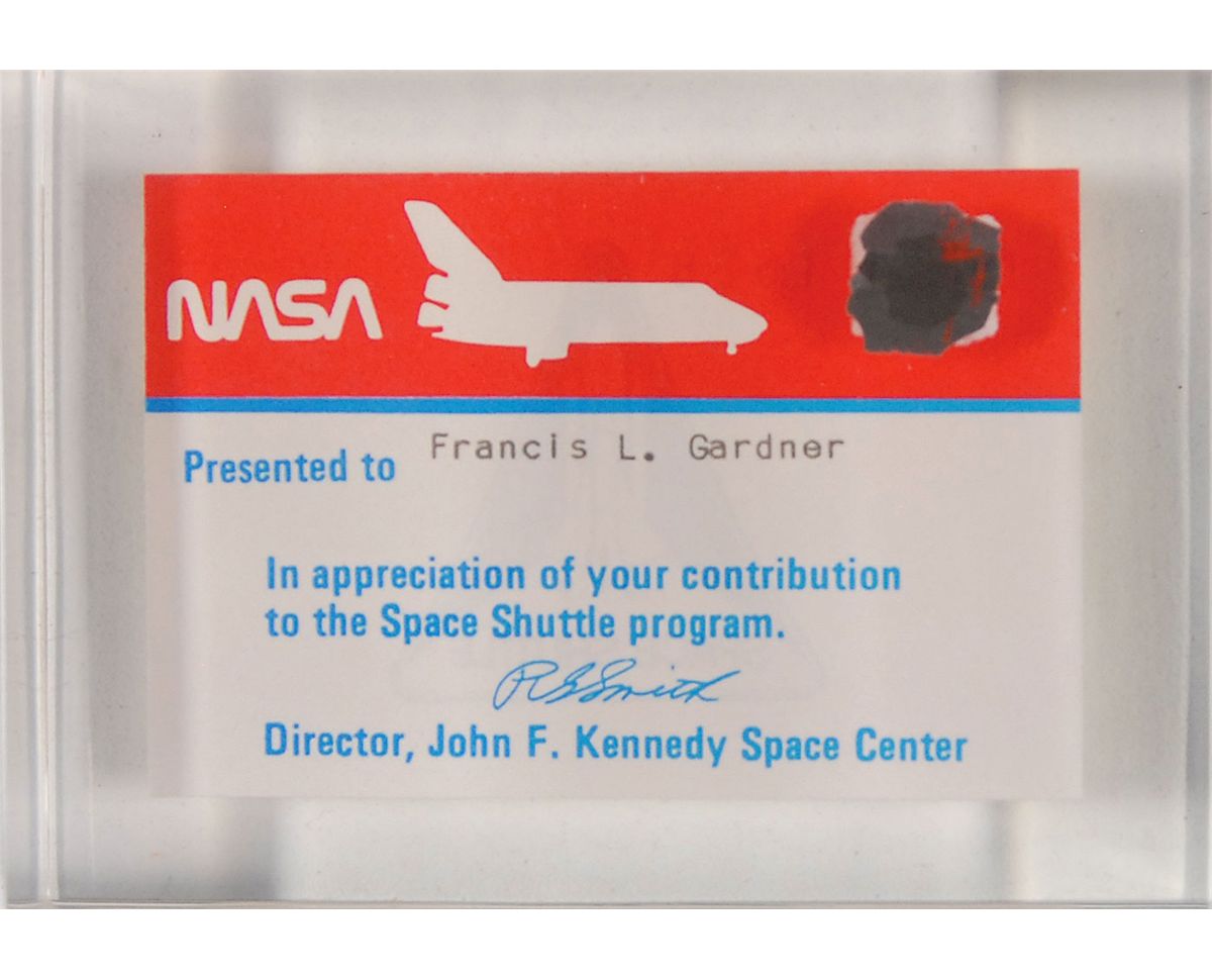 Official NASA flown heat shield fragment from STS-1, housed in a 3.75 x 2.75 Lucite block along with a NASA presentation to Francis L. Gardner. In fine condition.