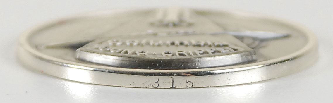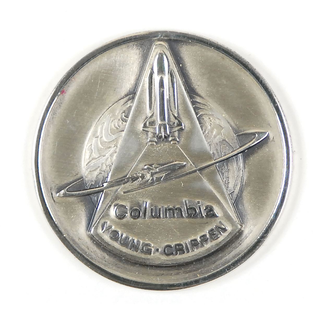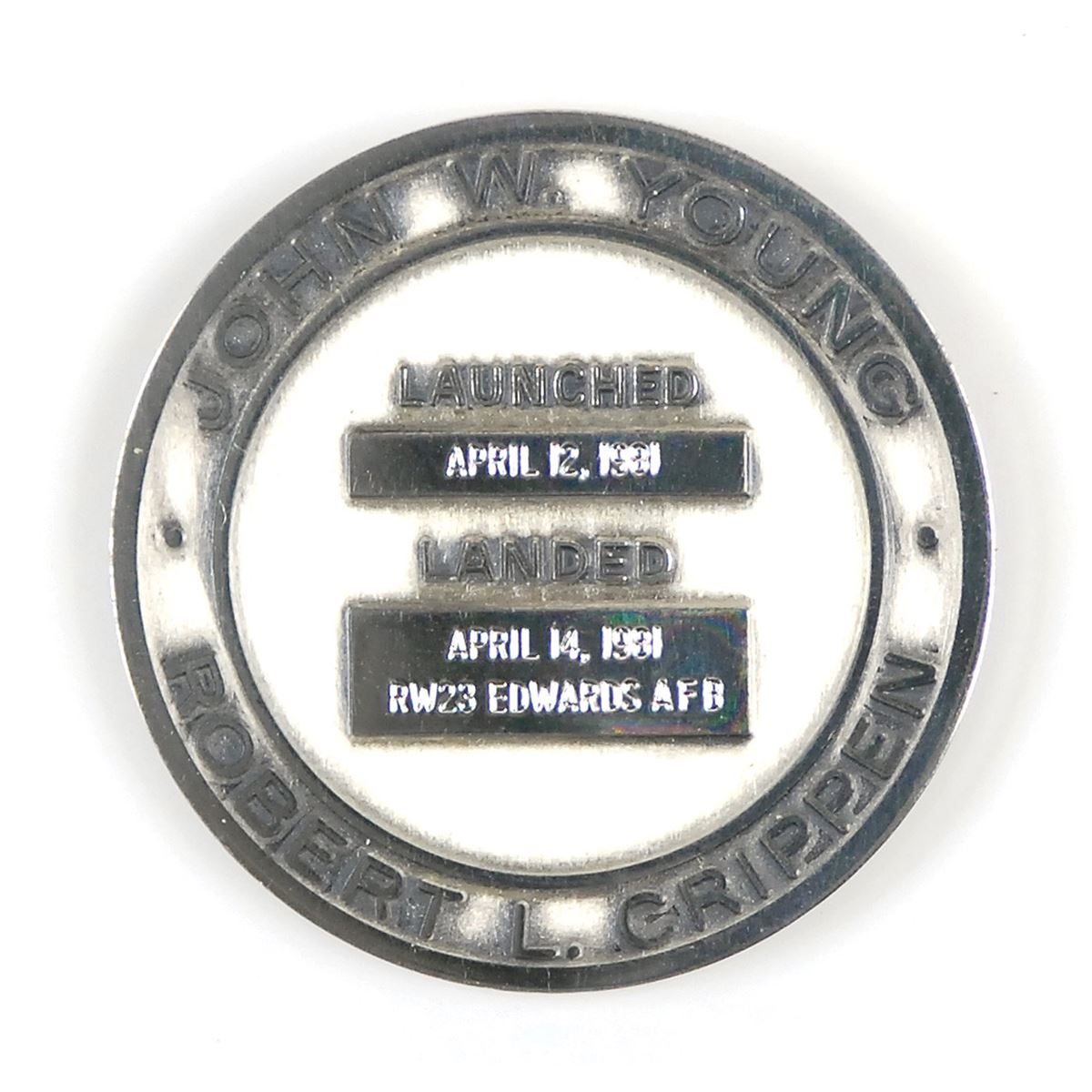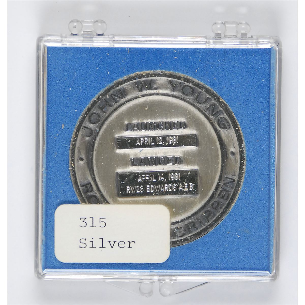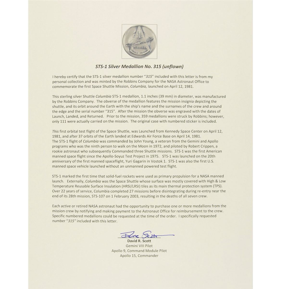 Unflown STS-1 Robbins medal, approximately 1.5? in diameter, with a raised design on the face featuring the mission insignia. The reverse is encircled by the names of the astronauts, John Young and Bob Crippen, and is engraved with the launch date of April 12, 1981, and landing date of April 14, 1981. The medal is serial numbered “315” and is accompanied by its original case, also labeled “315.” Condition is mint state. Accompanied by a letter of provenance from Dave Scott stating, in part: “I hereby certify that the STS-1 silver medallion number ‘315’ included with this letter is from my personal collection…Prior to the mission, 359 medallions were struck by Robbins; however, only 111 were actually carried on the mission.”