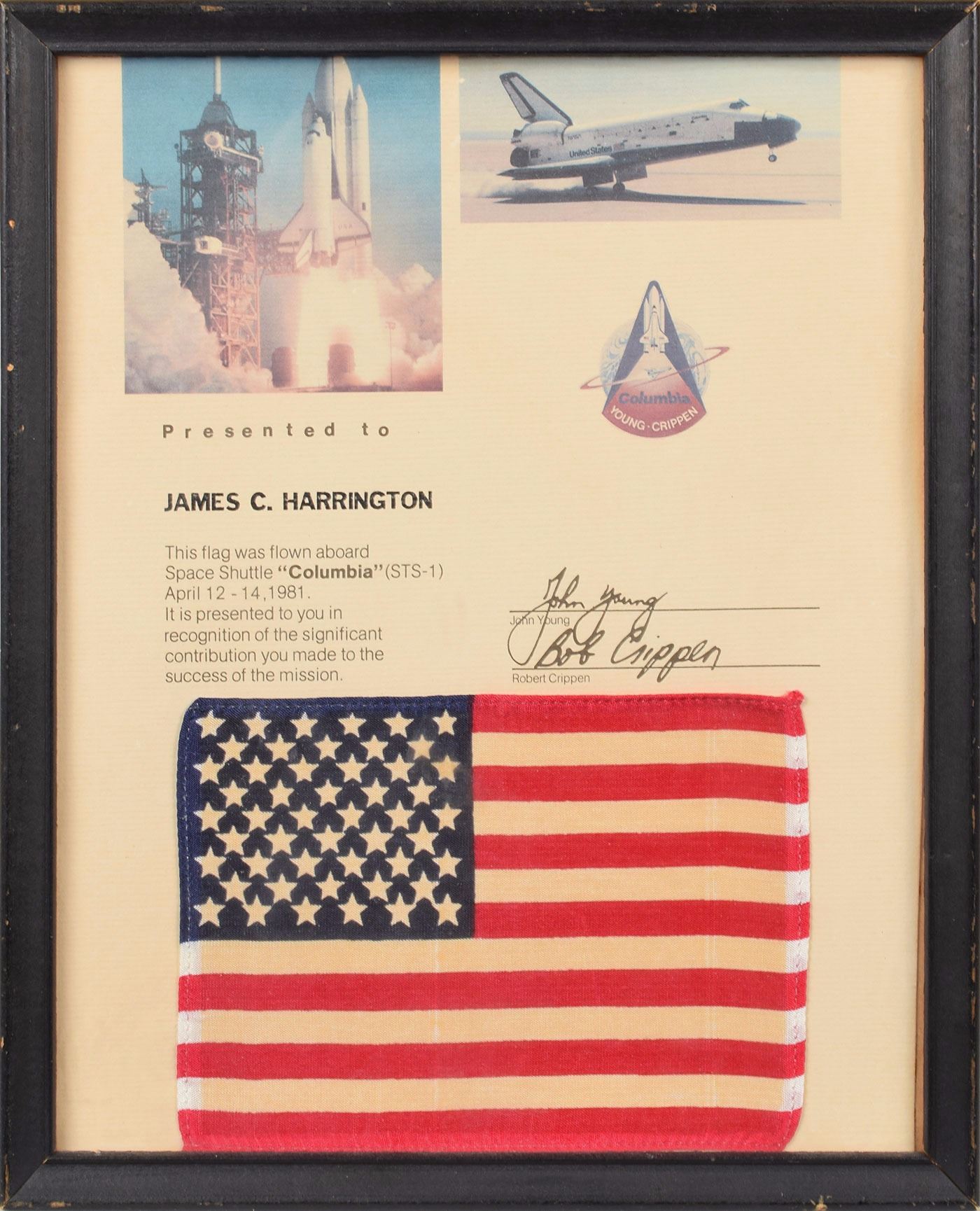 Flown fabric American flag, 5.75 x 4, flown aboard the Space Shuttle Columbia during its inaugural flight on April 12–14, 1981. Flag is affixed to a 7.75 x 9.75 certificate “Presented to James C. Harrington…in recognition of the significant contribution you made to the success of the mission.” Certificate also bears printed signatures of shuttle astronauts John Young and Bob Crippen. Framed with mild blocks of toning to flag, otherwise fine condition.