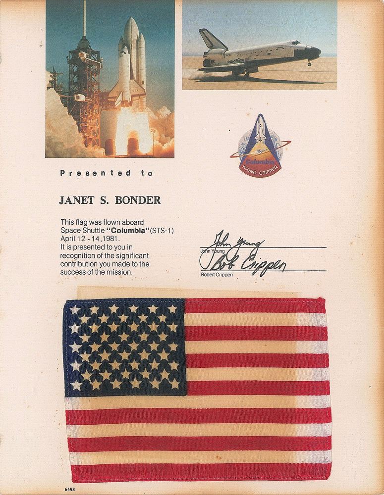 Flown fabric American flag, 5.75 x 4, flown aboard the Space Shuttle Columbia during its inaugural flight on April 12–14, 1981. Flag is detached from its 8.5 x 11 certificate, which reads “Presented to Janet S. Bonder…in recognition of the significant contribution you made to the success of the mission.” Certificate also bears printed signatures of shuttle astronauts John Young and Bob Crippen. In very good to fine condition, with toning to the edges of the certificate and to the flag, which has become detached from the mount due to dried adhesive.