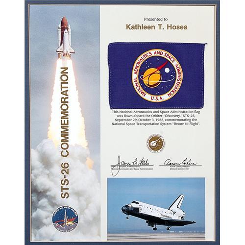 <Our item number 136922><B>STS-26, 1988, FLOWN NASA Flag.</B> (6x4") mounted on a multicolor presentation page (11x14, matted to 13x16") that reads: "This National Aeronautics and Space Administration flag was flown aboard the Orbiter "Discovery", STS-26, September 29-October 3, 1988, commemorating the National Space Transportation System "Return to Flight"." Attractive and unusually clean. <BR>Estimated Value $250 - 350. <BR><BR>Our item number 136922<BR><IMAGES><P ALIGN="CENTER"><IMG SRC="http://www.goldbergcoins.net/liveauction/49jpegs/136922.jpg"> </P></IMAGES>
