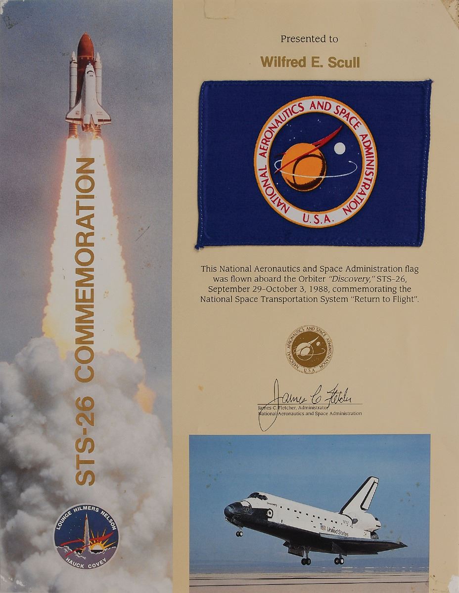 Flown National Aeronautics and Space Administration flag carried aboard the Space Shuttle Discovery on STS-26, September 29–October 3, 1988, 5.5 x 3.75, affixed to an official NASA presentation certificate bearing a printed signature of NASA’s administrator. In very good to fine condition, with tape remnants to corners of the certificate and some scattered foxing.