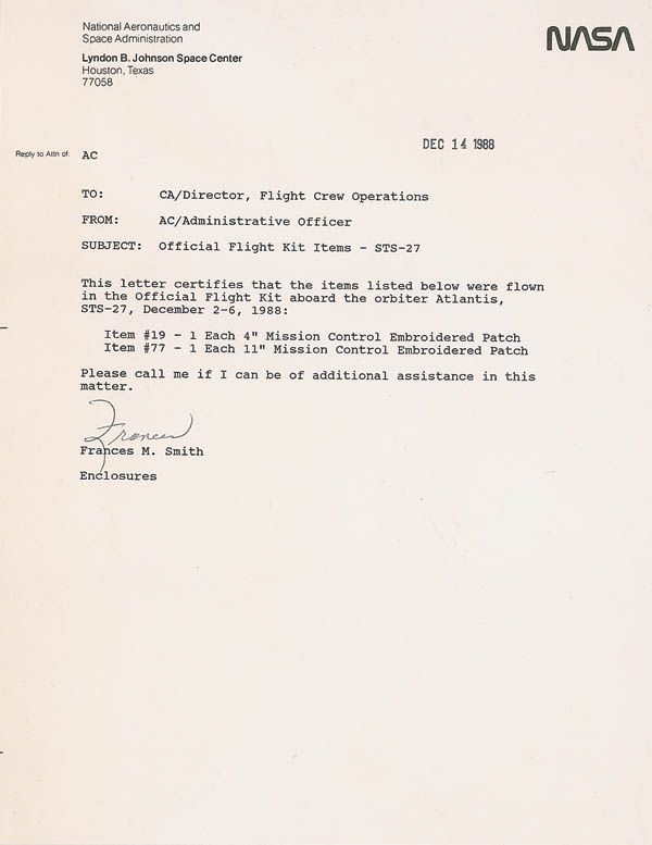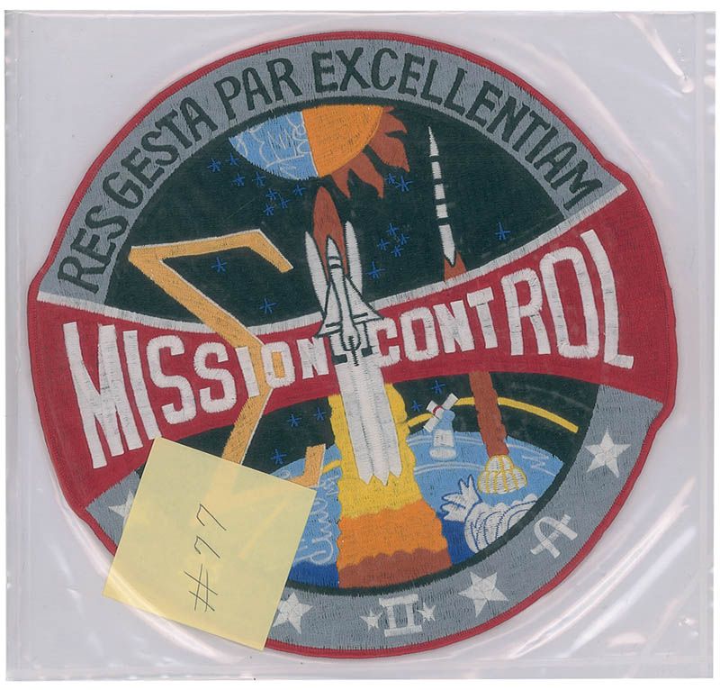 Huge flown Mission Control patch, 11.5? in diameter, carried on board the Atlantis on STS-27 from December 2–6, 1988. Accompanied by a 1988 letter from a NASA employee to the Director of Flight Crew Operations certifying that “Item #77—1 Each 11? Mission Control Embroidered Patch” was “flown in the Official Flight Kit aboard the orbiter Atlantis.” Patch is still sealed in its original plastic with a Post-It note numbered #77 inside the plastic. In fine condition. The mission control patch was designed for Gene Kranz by Robert McCall in 1973, with the Latin phrase across the top reading “Achievement Through Excellence.”