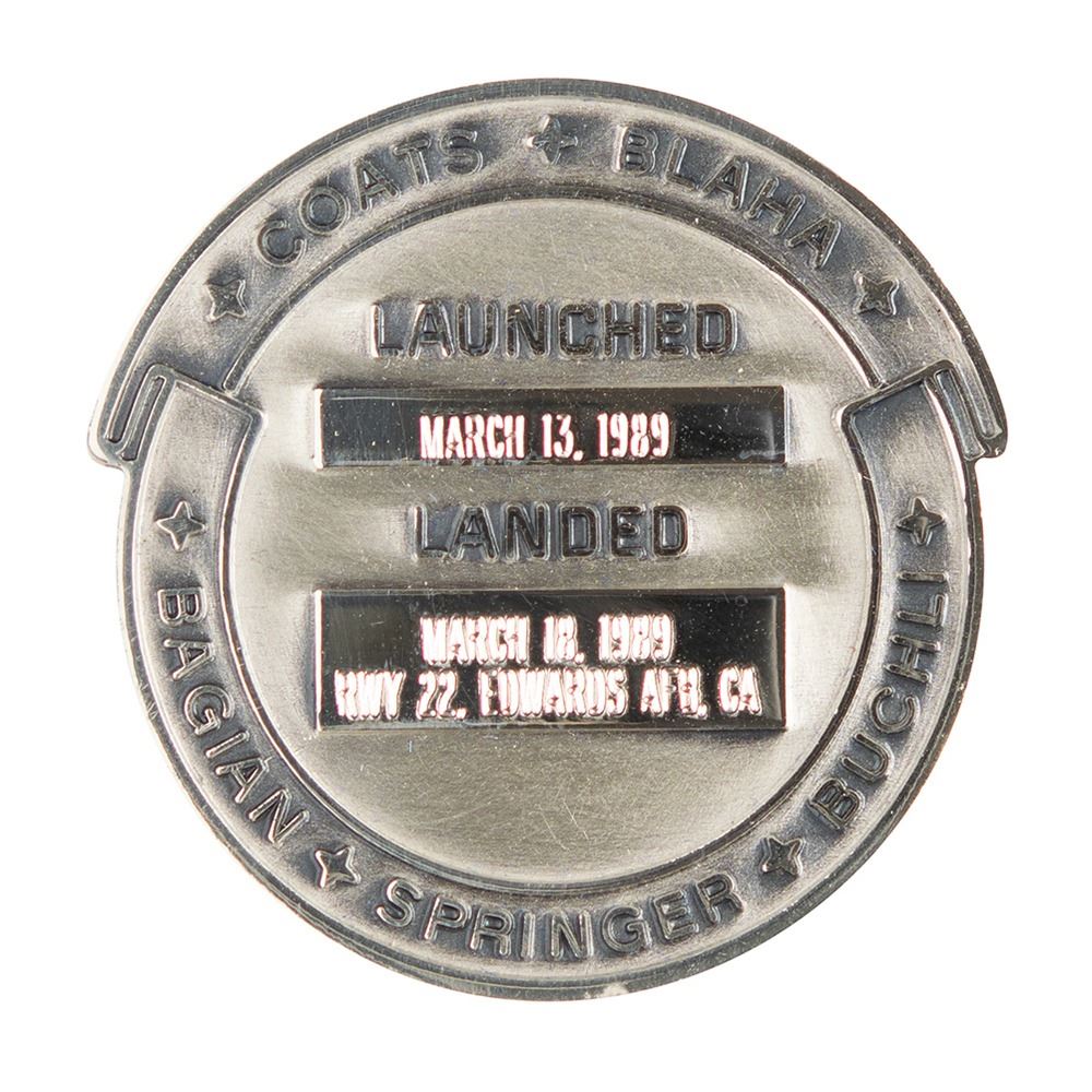 Unflown sterling silver STS-29 Robbins medal, approximately 1.5è in diameter, with a raised design on the face featuring the mission insignia. The reverse is encircled by the names of the astronauts, and is engraved with the launch date of March 13, 1989, and landing date of March 18, 1989. The medal is serial numbered "93" on the rim, and is accompanied by its original matching case. Condition is mint state.