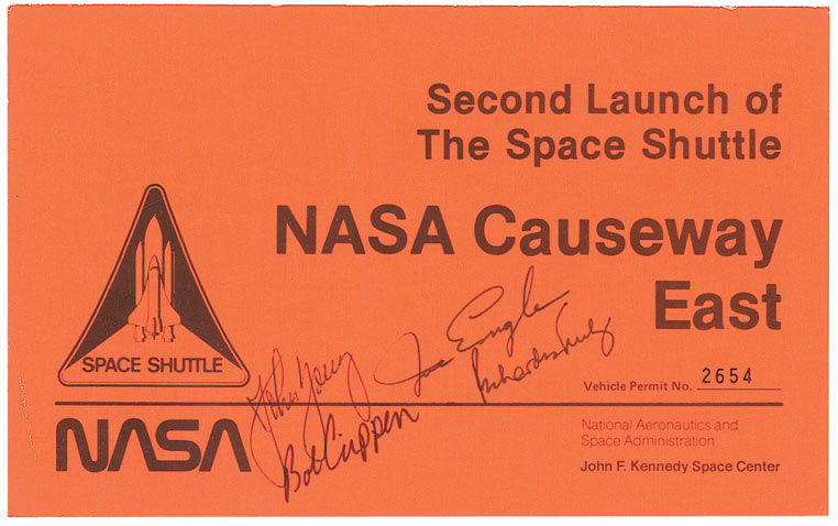 Unique florescent orange parking pass for the second launch of the space shuttle, 8 x 5, signed in black felt tip by John Young, Bob Crippen, Joe Engle, and Richard Truly. Accompanied by two unsigned passes for the launches of STS-3 and STS-8. In fine condition.