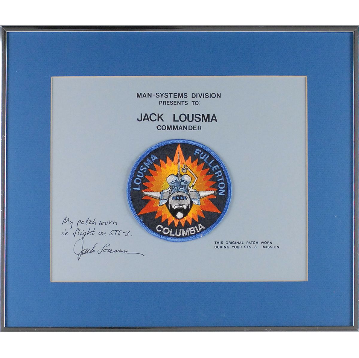 Flown embroidered STS-3 mission patch, 4? in diameter, worn during the mission by Commander Jack Lousma. Patch is affixed to a presentation certificate from the Man-Systems Division to Lousma, and signed in black felt tip, “My patch worn in flight on STS-3. Jack Lousma.” Matted and framed to an overall size of 14.25 x 12.25. In very fine condition. A scarce opportunity to own an actual mission-worn patch—not to be confused with a typical commemorative patch.