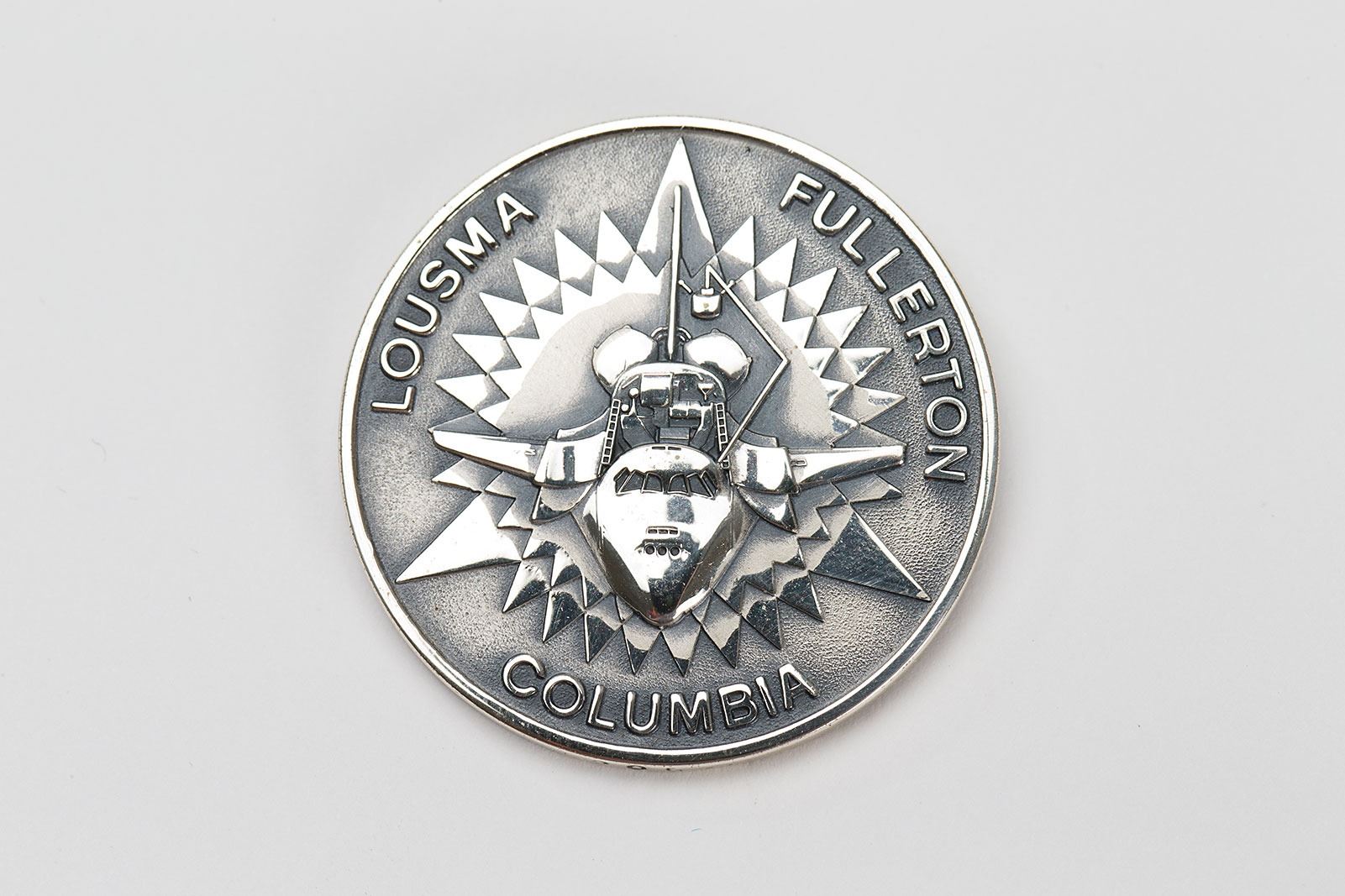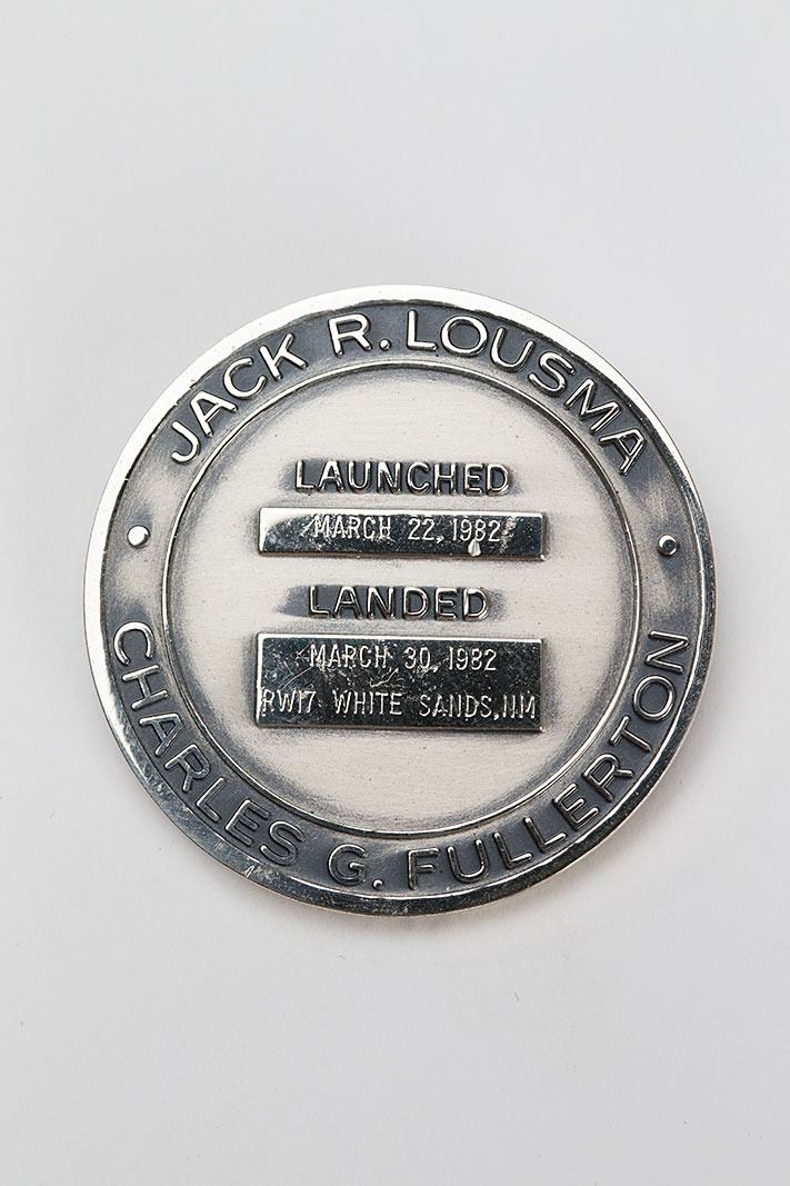 Unflown sterling silver STS-3 Robbins medal, approximately 1.5? in diameter, with a raised design on the face featuring the mission insignia. The reverse is encircled by the names of the astronauts, "Jack R. Lousma" and "Charles G. Fullerton," and is engraved with the launch date of March 22, 1982, and landing date of March 30, 1982. The medal is serial numbered "205" on the rim, and is accompanied by its original case. Condition is mint state.