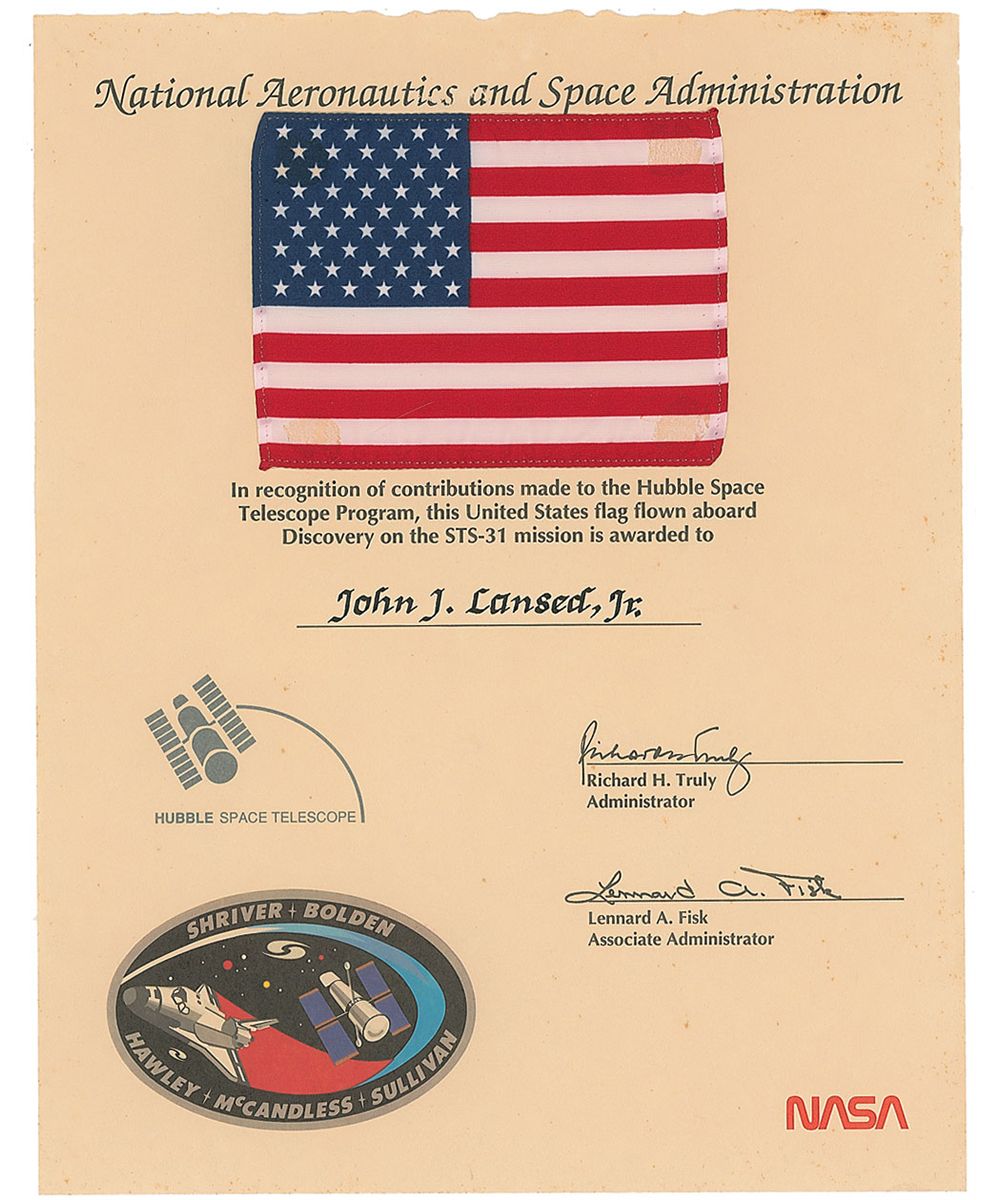 Flown printed fabric American flag, 5.75 x 4, flown aboard the Space Shuttle Discovery during its April 1990 mission which launched the Hubble telescope. Flag is affixed to an 11 x 14 certificate stating, “In recognition of contributions made to the Hubble Space Telescope program, this United States flag flown aboard Discovery on the STS-31 mission is awarded to John J. Lansed, Jr.” Certificate also bears printed signatures of Richard Truly and Lennard A. Fisk. In fine condition, with four light spots of toning at corners from adhesive on reverse.
