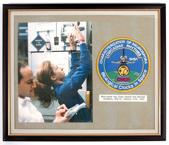 STS-32, 1990, FLOWN "Characterization of Neurospora Circadian Rhythms" Mission Patch (4") mounted on a presentation card along with a color photo (5.5x7.5") of the experiment in space. There is a descriptive note below the patch that reads: "This patch was flown aboard the orbiter Columbia, STS-32, January 9-20, 1990". ALSO included is a copy of a NASA letter stating that 50 of these mission patches "…were flown in the Official Flight Kit (OFK) aboard the Orbiter Columbia, STS-32…". This patch is almost never available.