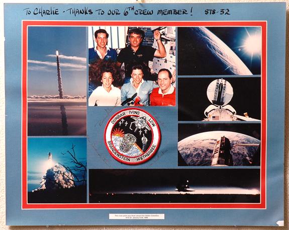 STS-32, 1990, FLOWN Crew Patch. Mounted on a multicolor presentation board (20x16") that is inscribed at top: "To Charlie - Thanks to our 6th Crew Member! STS-32". The complete crew have signed the board surrounding the patch. There is a descriptive label at the bottom that reads: "This crew patch was flown aboard the Orbiter Columbia, STS-32, January 9-20, 1990". Some edge faults as a result of having met Houston hurricane "Gustav" in August 2008, otherwise this piece is ready and willing to join a new home.