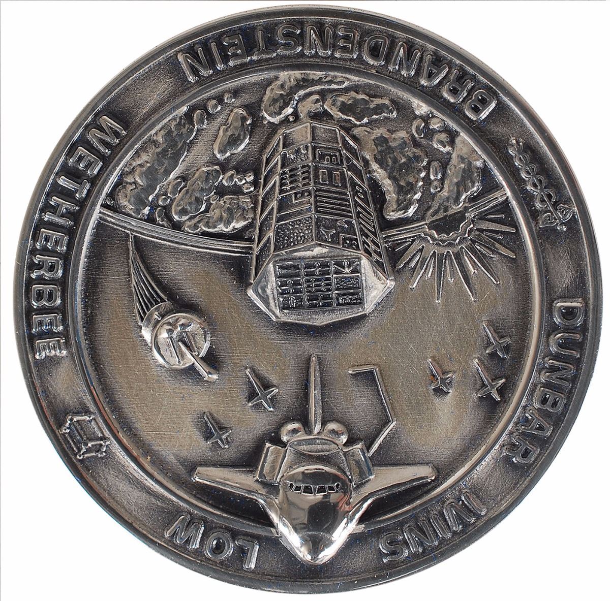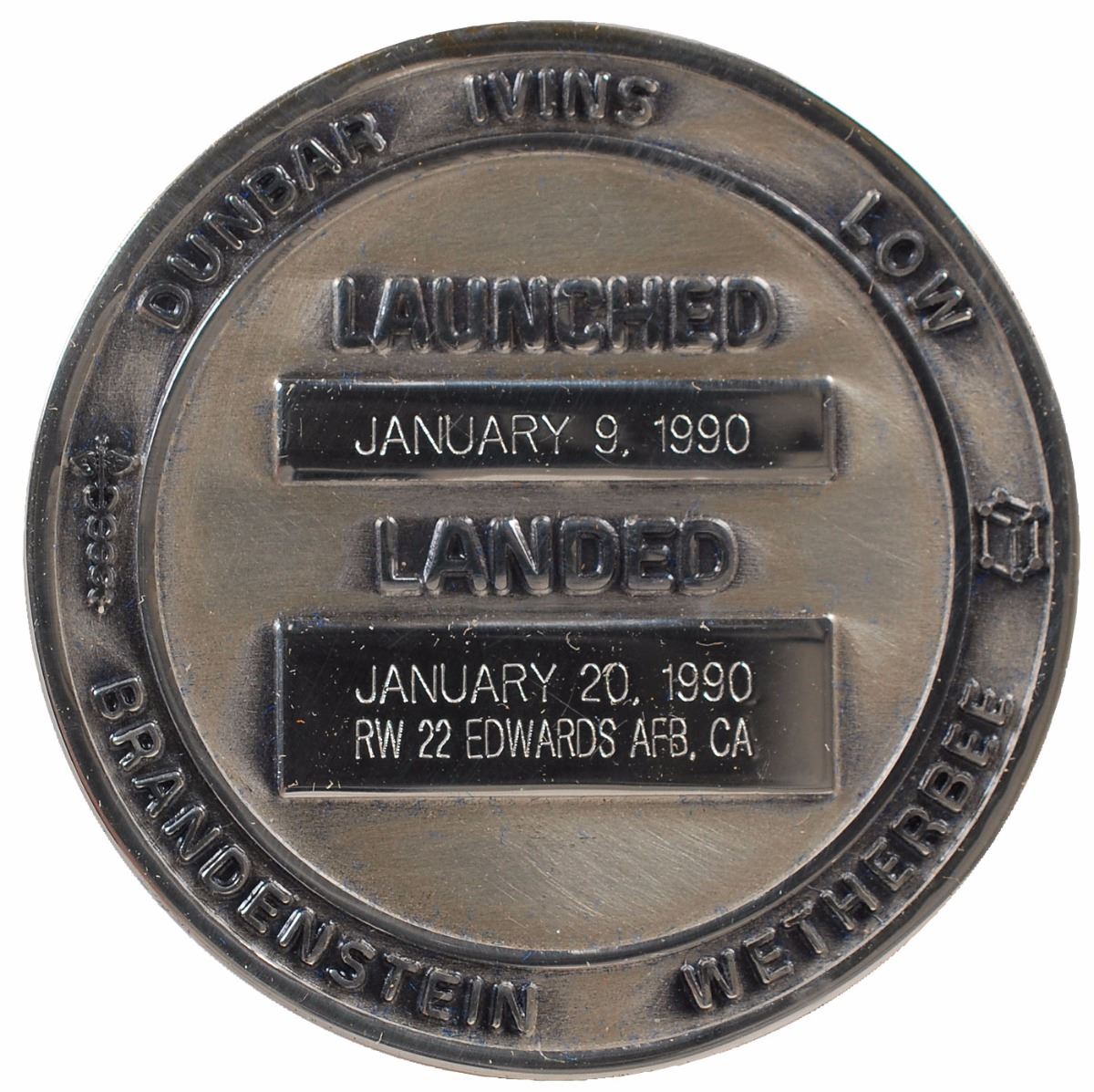 Unflown sterling silver STS-32 Robbins medal, approximately 1.5? in diameter, with a raised design on the face featuring the mission insignia. The reverse is encircled by the names of the astronauts, and is engraved with the launch date of January 9, 1990, and landing date of January 20, 1990. The medal is serial numbered “71” on the rim, and is accompanied by its matching case. Condition is mint state.