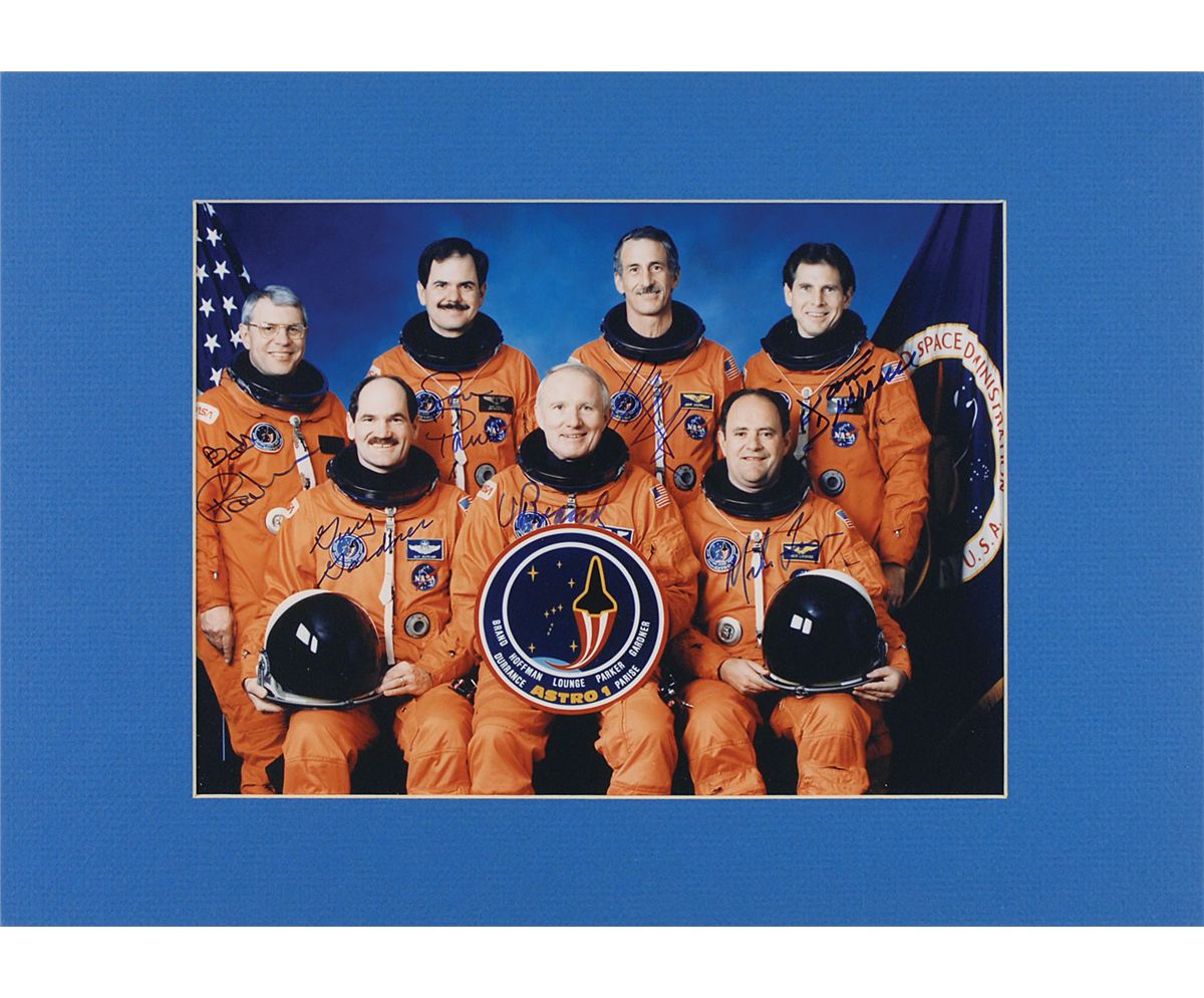 Color satin-finish 14 x 10 photo of the STS-35 crew, signed in blue felt tip by all seven astronauts: Vance D. Brand, Guy S. Gardner, Jeffrey A. Hoffman, Mike Lounge, Robert A. Parker, Samuel T. Durrance, and Ronald A. Parise. Matted in its original blue NASA presentation mat to an overall size of 14 x 11. In fine condition.