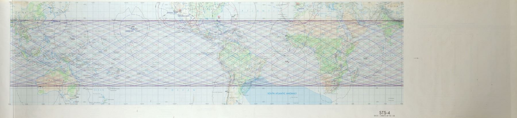 Color first edition of the STS-4 Earth orbital chart, measuring 52 x 11.75, marked in the lower right corner, "Space Shuttle Mission Chart STS-4, Front - Orbits 1 to 48, Edition-1, April 1982." The opposite side features orbits 49 to 128. A table on the front denotes the ground elapsed time for each orbit. Rolled and in fine condition.