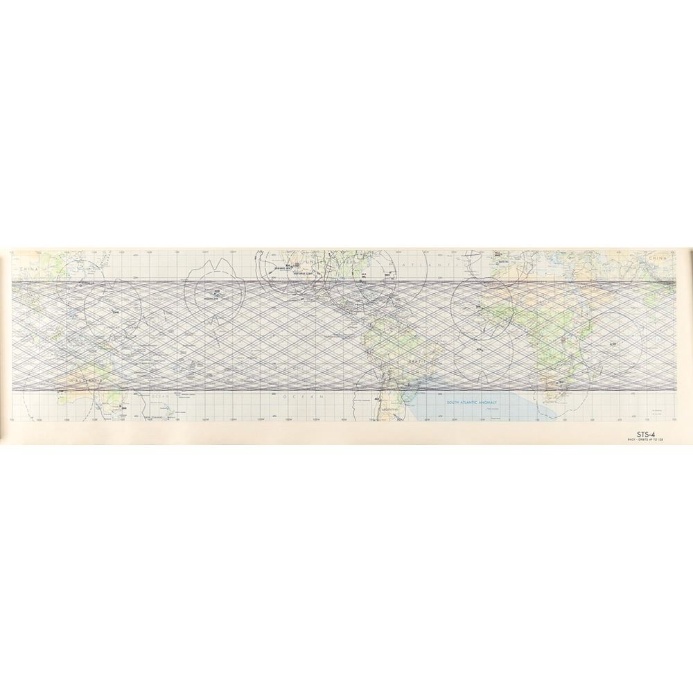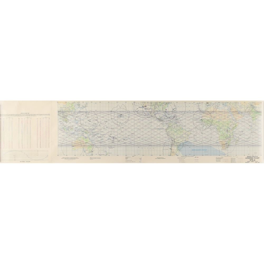 Color first edition of the STS-4 Earth orbital chart, measuring 52 x 11.75, marked in the lower right corner, "Space Shuttle Mission Chart STS-4, Front - Orbits 1 to 48, Edition-1, April 1982." The opposite side features orbits 49 to 128. A table on the front denotes the ground elapsed time for each orbit. Rolled and in fine condition.