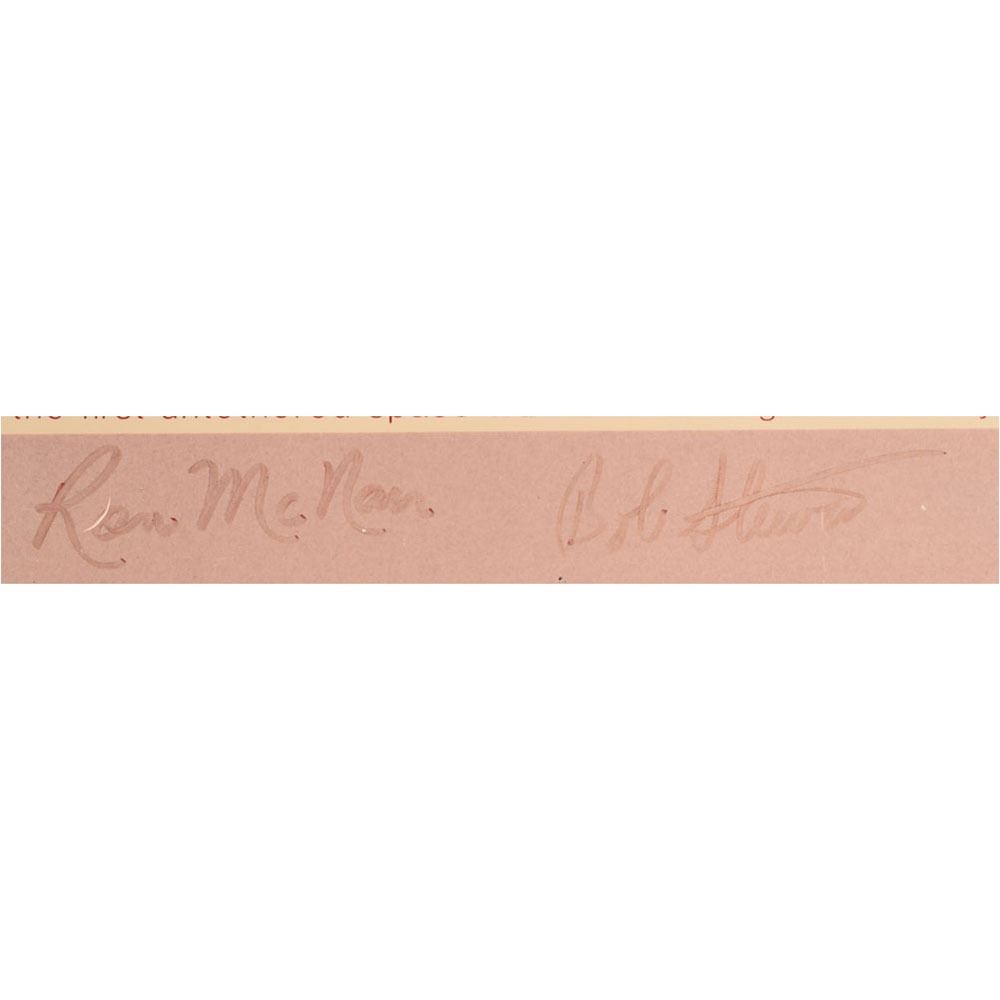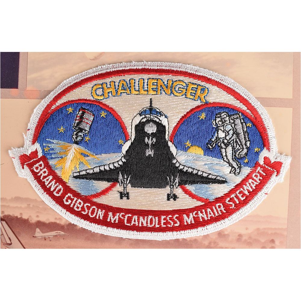Color glossy 20 x 16 composite photo of the STS-41-B crew and various images from their nearly 8-day mission, featuring a flown embroidered mission patch affixed to lower right, signed in the lower border in black felt tip by Vance Brand, Hoot Gibson, Ron McNair, Bob Stewart, and Bruce McCandless, with an inscription to the upper border: "To Kandy Hosea‰ÛÓmany thanks for your great support of STS 41-B!" Caption inherent to bottom area of photo reads: "This patch was flown aboard the Space Shuttle 'Challenger' (STS 41-B) during the first untethered space walk and landing at Kennedy Space Center. February 3‰ÛÒ11, 1984." Photo is mounted to a same-size cardstock board. In very good condition, with overall fading, two short tears to the bottom edge, and some light scratching and gouging to the image. STS-41-B included the first untethered spacewalks, accomplished by Bruce McCandless and Bob Stewart.