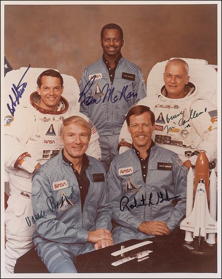 Color 8 x 10 NASA photo of the crew of STS-41-B, signed in blue or black felt tip by Vance D. Brand, Robert L. Gibson, Bruce McCandless II, Ron McNair and Bob Stewart. In fine condition with a couple small corner bends and creases.
