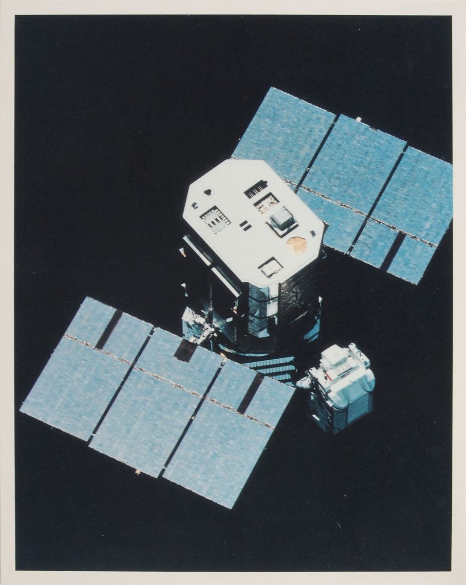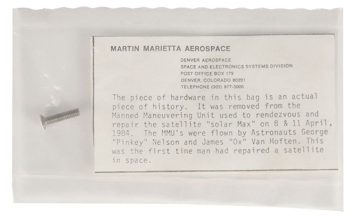 Flown screw removed from a Manned Maneuvering Unit (MMU) used by either Pinky Nelson or Ox van Hoften on the Challenger STS-41-C mission in April 1984. The white-capped screw measures approximately .75? long and is sealed with a certificate of authenticity from Martin Marietta Aerospace stating that it was removed from an MMU used on the mission to capture and repair the ‘Solar Max’ satellite, which was the first time man had repaired a satellite in space. In fine condition. Accompanied by an official Martin Marietta photo of Nelson flying in an MMU as he prepares to dock with the malfunctioning satellite. From the collection of aerospace memorabilia specialist Ken Havekotte.