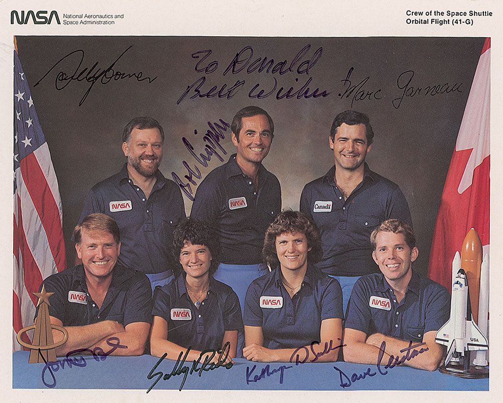 Color 10 x 8 NASA photo of the Challenger crew, signed in black felt tip by Bob Crippen, Jon McBride, Sally Ride, Kathryn Sullivan, and David Leestma, with Crippen adding a brief inscription. Photo also bears autopen signatures of Paul Scully-Power and Marc Garneau. In fine condition.