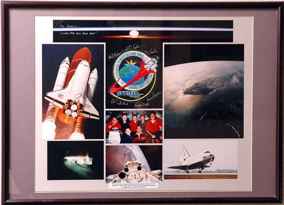 STS-45, 1992, FLOWN Crew Patch. Mounted on a framed multicolor presentation board (20x16"). The board is crew signed by Boldon, Duffy, Sullivan, Leestma, Foale and Frimout (not Lichtenberg) at the bottom and inscribed at the top: "To Charlie - Thanks for your help!" There is a descriptive label at the bottom that reads: "This patch was flown aboard the the Orbiter Atlantis, Mission STS-45, March 24-April 2, 1992, which carried the first Atmospheric Laboratory for Applications and Science ATLAS-1)". This is the first flown patch from this flight we have seen.