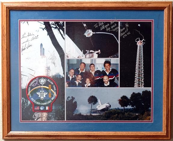 STS-46, 1992, Crew Patch (4.5x4") mounted on a framed multicolor montage (22x18") that is inscribed in silver marker: "To Bob - With our thanks for your support! From the crew of STS-46". It would appear that the montage is hand-signed by at least some of the crew members (Shriver, Ivins, Allen, etc), but a couple of the signatures have faded almost completely out. Attractive.